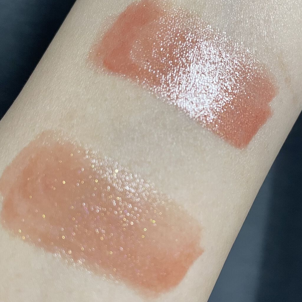 mude.の方がよりあたたかみのある印象で全体的に使いやすい色味が入っている感じ◎ ラメ感もギラギラするよりかは上品なキラキラ感✨ rom&ndはmude.に比べるとフレッシュな印象!春や夏に使うと映えそう❣️ ラメ感も強く、目立つかな。 似てるかもしれないからと買うのを長い間悩んでいましたが、仕上がりが全然変わってくるので、買って良かった😂❤️ 粉質はブランドも違うので違ったよ✨ rom&ndの方がしっとり感があって強く発色する感じ。 mude.は淡い発色で、初心者さんも使いやすいと思った🫶🏻