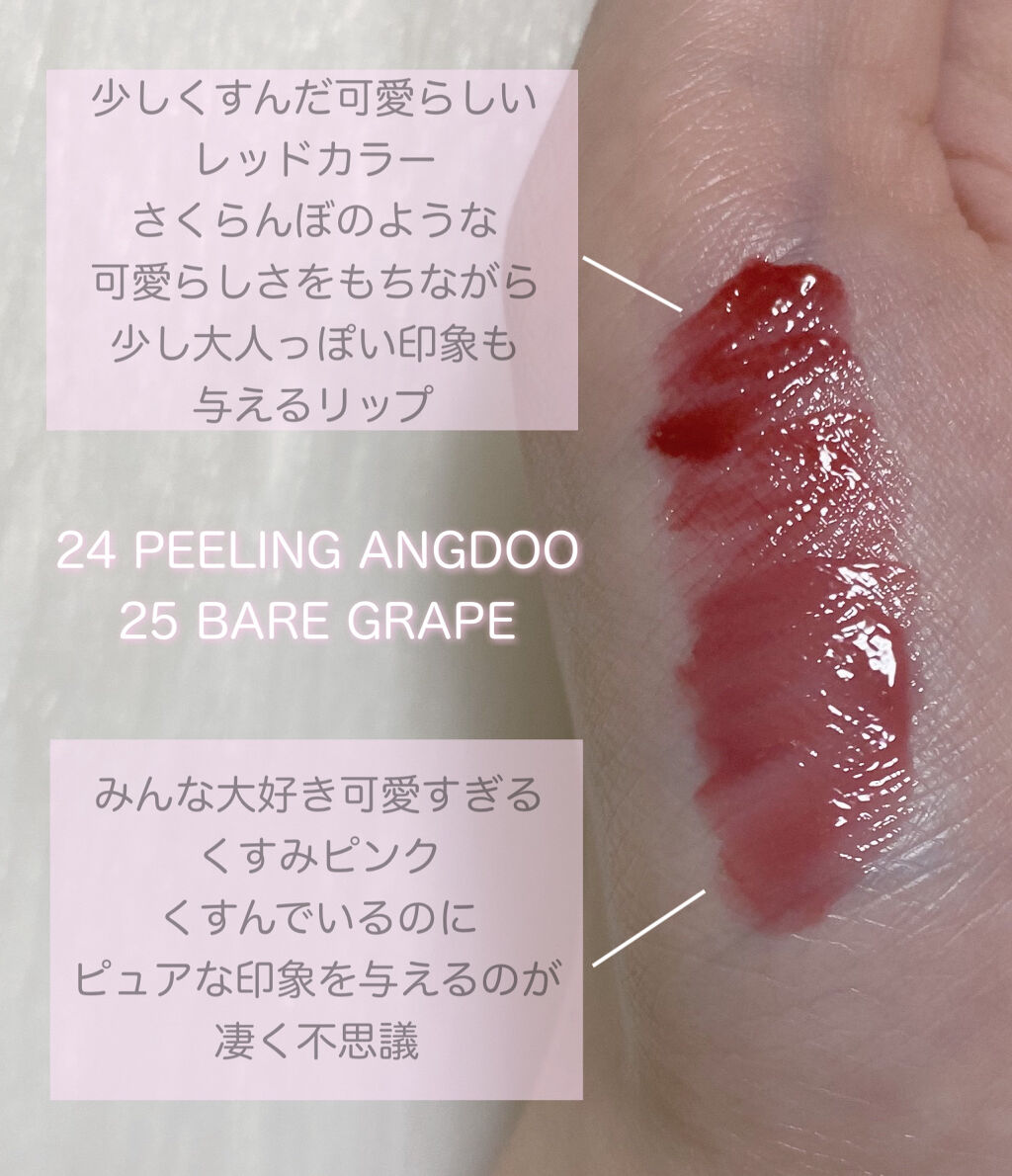 - <06 フィグフィグ(FIGFIG)> 水、オクチルドデカノール、ジメチコン、変性アルコール、アクリレーツコポリマー、ステアリン酸ソルビタン、エチルセルロース、ベヘニルアルコール、ペンチレングリコール、キウイエキス、パパイア果実エキス、グレープフルーツ果実エキス、ココヤシ果実エキス、マンゴー果実エキス、グアバ果実エキス、ポリソルベート60、シリカ、(アクリル酸Na/アクリロイルジメチルタウリンNa)コポリマー、リンゴ酸ジイソステアリル、トリイソステアリン酸ポリグリセリル-2、イソヘキサデカン、ポリソルベート80、ジイソステアリン酸ポリグリセリル-2、オレイン酸ソルビタン、エチルヘキシルグリセリン、BG、EDTA-2Na、フェノキシエタノール、香料、酸化チタン、酸化鉄、赤202、赤227、黄5、赤102、青1 <07 ジュジュブ(JUJUBE)> 水、オクチルドデカノール、ジメチコン、変性アルコール、アクリレーツコポリマー、ステアリン酸ソルビタン、エチルセルロース、ベヘニルアルコール、ペンチレングリコール、キウイエキス、パパイア果実エキス、グレープフルーツ果実エキス、ココヤシ果実エキス、マンゴー果実エキス、グアバ果実エキス、ポリソルベート60、シリカ、(アクリル酸Na/アクリロイルジメチルタウリンNa)コポリマー、トリイソステアリン酸ポリグリセリル-2、リンゴ酸ジイソステアリル、イソヘキサデカン、ポリソルベート80、ジイソステアリン酸ポリグリセリル-2、オレイン酸ソルビタン、エチルヘキシルグリセリン、BG、EDTA-2Na、フェノキシエタノール、香料、酸化チタン、酸化鉄、赤202、赤227、黄5、黄4、青1 <08 アップルブラウン(APPLE BROWN)> 水、オクチルドデカノール、ジメチコン、変性アルコール、アクリレーツコポリマー、ステアリン酸ソルビタン、エチルセルロース、ベヘニルアルコール、ペンチレングリコール、キウイエキス、パパイア果実エキス、グレープフルーツ果実エキス、ココヤシ果実エキス、マンゴー果実エキス、グアバ果実エキス、ポリソルベート60、シリカ、(アクリル酸Na/アクリロイルジメチルタウリンNa)コポリマー、トリイソステアリン酸ポリグリセリル-2、イソヘキサデカン、リンゴ酸ジイソステアリル、ポリソルベート80、ジイソステアリン酸ポリグリセリル-2、オレイン酸ソルビタン、エチルヘキシルグリセリン、BG、EDTA-2Na、フェノキシエタノール、香料、酸化鉄、黄5、赤202、酸化チタン、赤227、青1 <11 ピンクパンプキン(PINK PUMPKIN)> 水、オクチルドデカノール、ジメチコン、変性アルコール、アクリレーツコポリマー、ステアリン酸ソルビタン、エチルセルロース、ベヘニルアルコール、ペンチレングリコール、キウイエキス、パパイア果実エキス、グレープフルーツ果実エキス、ココヤシ果実エキス、マンゴー果実エキス、グアバ果実エキス、ポリソルベート60、シリカ、(アクリル酸Na/アクリロイルジメチルタウリンNa)コポリマー、リンゴ酸ジイソステアリル、イソヘキサデカン、トリイソステアリン酸ポリグリセリル-2、ポリソルベート80、ジイソステアリン酸ポリグリセリル-2、オレイン酸ソルビタン、エチルヘキシルグリセリン、BG、EDTA-2Na、フェノキシエタノール、香料、酸化チタン、酸化鉄、赤202、黄4、赤227、黄5、赤104(1) <22 ポメロスキン(POMELO SKIN)> 水、オクチルドデカノール、ジメチコン、変性アルコール、アクリレーツコポリマー、ポリソルベート60、エチルセルロース、ベヘニルアルコール、ペンチレングリコール、(アクリル酸Na/アクリロイルジメチルタウリンNa)コポリマー、シリカ、ステアリン酸ソルビタン、イソヘキサデカン、リンゴ酸ジイソステアリル、フェノキシエタノール、酸化チタン、トリイソステアリン酸ポリグリセリル-2、ポリソルベート80、酸化鉄、香料、オレイン酸ソルビタン、エチレンジアミンジコハク酸3Na、エチルヘキシルグリセリン、赤202、ジイソステアリン酸ポリグリセリル-2、赤227、黄5、青1、BG、キウイエキス、パパイア果実エキス、グレープフルーツ果実エキス、ココヤシ果実、マンゴー果実エキス、グアバ果実エキス <23 ヌカダミア(NUCADAMIA)> 水、オクチルドデカノール、ジメチコン、変性アルコール、アクリレーツコポリマー、ポリソルベート60、エチルセルロース、ベヘニルアルコール、ペンチレングリコール、(アクリル酸Na/アクリロイルジメチルタウリンNa)コポリマー、シリカ、ステアリン酸ソルビタン、イソヘキサデカン、フェノキシエタノール、リンゴ酸ジイソステアリル、酸化チタン、ポリソルベート80、トリイソステアリン酸ポリグリセリル-2、酸化鉄、香料、オレイン酸ソルビタン、エチレンジアミンジコハク酸3Na、赤202、赤227、黄5、ジイソステアリン酸ポリグリセリル-2、エチルヘキシルグリセリン、黄4、青1、BG、キウイエキス、パパイア果実エキス、グレープフルーツ果実エキス、ココヤシ果実、マンゴー果実エキス <24 ピーリングエンドゥ(PEELING ANGDOO)> 水、オクチルドデカノール、ジメチコン、変性アル