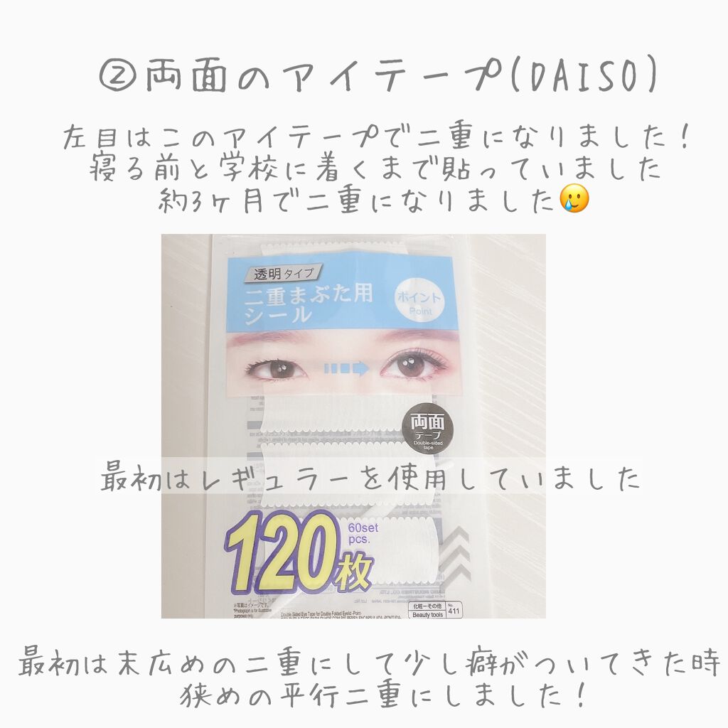元々一重瞼でしたが、昼間は接着式アイプチで癖付け、夜はアイテープを付けて癖付けをしたことで、今は昼間は皮膜式アイプチで二重をキープ出来ています✨️ アイプチを塗っているところはまつ毛の際と二重の線の真下なので、使う量も比較的少なく、見た目もほとんど気になりません🤗 ルドゥーブルが深くくい込むのでルドゥーブルがオススメです!