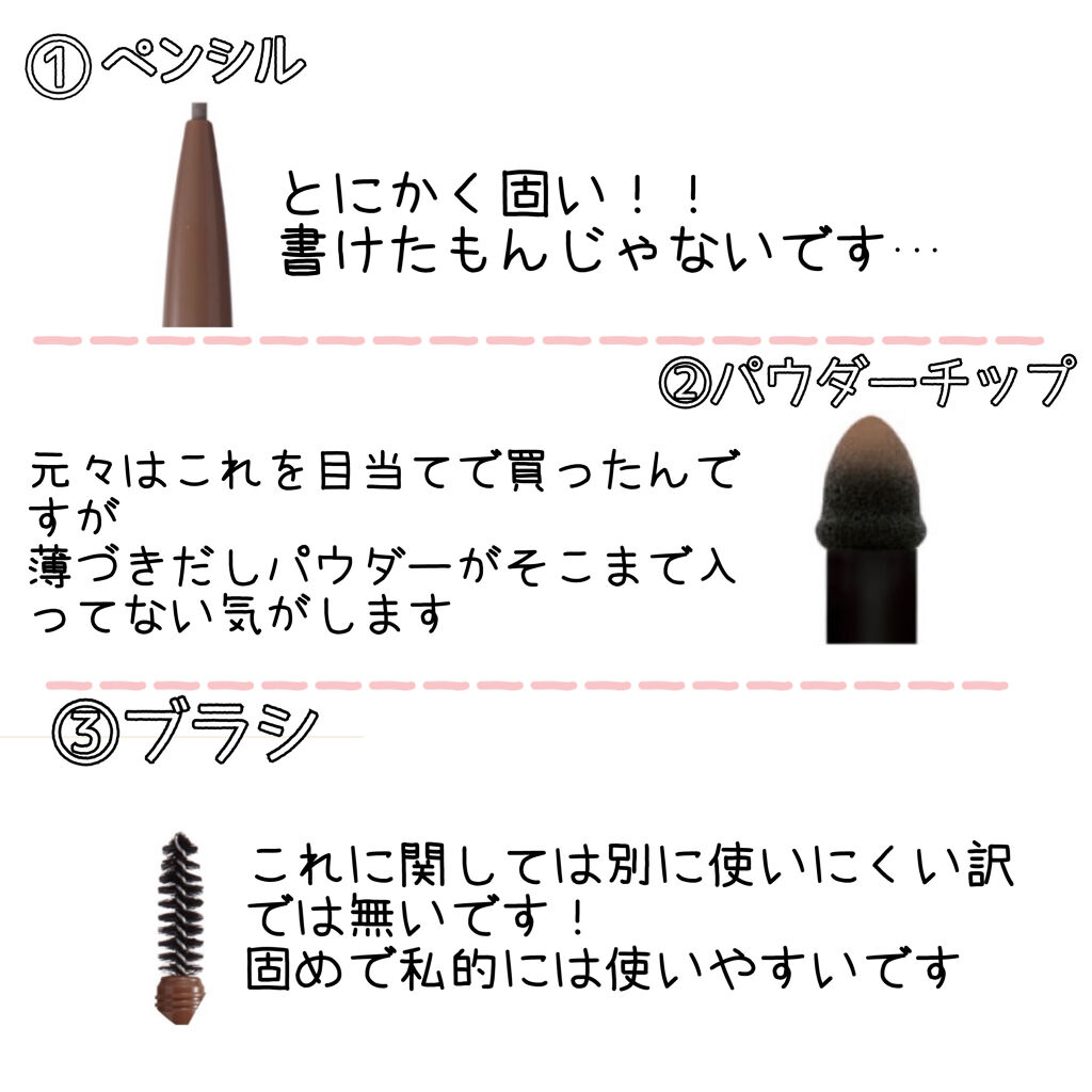 - 1本3役!これ1本で簡単に立体的な眉が完成! パウダー・ペンシル・ブラシが1本になった便利なアイブロウ ふんわり高密着なパウダー:マットな質感でふんわり眉に。 安定して描きやすい丸チップ採用。細眉も太眉も描きやすい♪ ペンシル:1.5mm極細ペンシル。肌あたりのやわらかい芯で描きやすい! ブラシ付なので、ボカしも簡単!