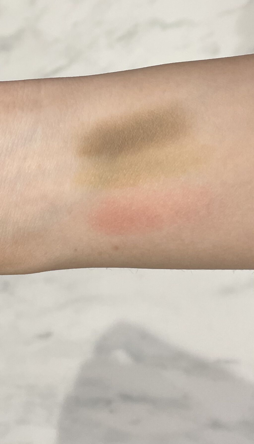 - <PK10 ピンク系ブラウン> 着色成分 マイカ適量、〃 酸化鉄適量、〃 赤226適量、油性エモリエント成分 ジメチコン0.09、〃 リンゴ酸ジイソステアリル3.50%、感触改良成分 シリカ3.00%、〃 ラウリン酸亜鉛2.00%、防腐剤 メチルパラベン0.30%、基剤 タルク全量を100%とする <GR30 グリーン系ブラウン> 着色成分 マイカ適量、〃 酸化鉄適量、〃 グンジョウ適量、油性エモリエント成分 ジメチコン0.09、〃 リンゴ酸ジイソステアリル3.50%、感触改良成分 シリカ3.00%、〃 ラウリン酸亜鉛2.00%、防腐剤 メチルパラベン0.30%、基剤 タルク全量を100%とする <OR10 テラコッタ> 着色成分 マイカ適量、〃 酸化鉄適量、油性エモリエント成分 ジメチコン0.09、〃 リンゴ酸ジイソステアリル0.035、感触改良成分 シリカ3.00%、〃 ラウリン酸亜鉛2.00%、防腐剤 メチルパラベン適量、基剤 タルク全量を100%とする
