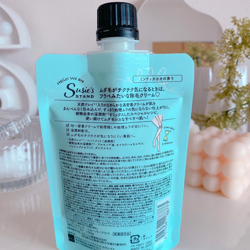 スージースタンドリムーバーフラペ💫150g1650円(税込)最近、気になっていた除毛クリームをお試しさせて頂きました🌿パッケージが可愛くて、除毛クリームに見えないところが素敵🥰塗るだけで、サロン帰りのようなツルスベ肌に✨おうちで簡単ムダ毛ケア...