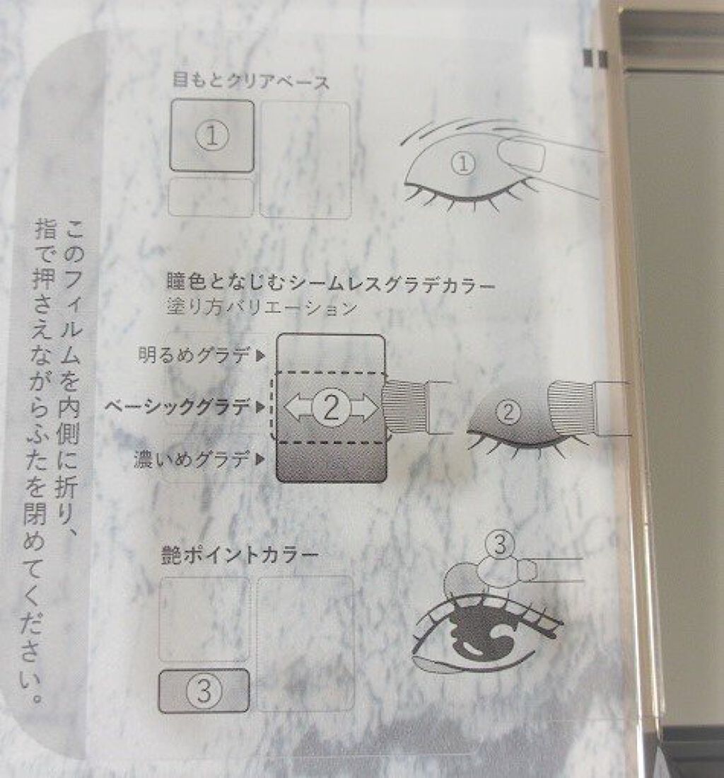 - (1)目もとクリアベース イソステアリルアルコール,ジメチコン,トリ(カプリル酸/カプリン酸)グリセリル,イソステアリン酸水添ヒマシ油,(ビニルジメチコン/メチコンシルセスキオキサン)クロスポリマー,マイクロクリスタリンワックス,水添ヒマシ油,セルロース,ポリエチレン,水添ポリイソブテン,ヒアルロン酸Na,パラフィン,合成ワックス,トコフェロール,リンゴ酸ジイソステアリル,アルミナ,トリ酢酸テトラステアリン酸スクロース,シリカ,ポリリシノレイン酸ポリグリセリル-6,BHT,プロピルパラベン,メチルパラベン,マイカ,合成金雲母,酸化チタン,酸化鉄 (2)シームレスグラデカラー タルク,ラウロイルリシン,ジメチコン,リンゴ酸ジイソステアリル,イソステアリン酸水添ヒマシ油,トリエチルヘキサン酸トリメチロールプロパン,ワセリン,セスキイソステアリン酸ソルビタン,ヒアルロン酸Na,ジステアリン酸Al,トコフェロール,シリカ,酸化スズ,アルミナ,エチルパラベン,メチルパラベン,クロルフェネシン,マイカ,酸化鉄,酸化チタン,合成金雲母,グンジョウ,赤226,黄4 (3)艶ポイントカラー タルク,リンゴ酸ジイソステアリル,ワセリン,ジメチコン,トリエチルヘキサン酸トリメチロールプロパン,メタクリル酸メチルクロスポリマー,イソステアリン酸水添ヒマシ油,ヒアルロン酸Na,セスキイソステアリン酸ソルビタン,ジステアリン酸Al,トコフェロール,酸化スズ,アルミナ,シリカ,メチルパラベン,エチルパラベン,クロルフェネシン,合成金雲母,マイカ,酸化チタン,酸化鉄,グンジョウ,赤226,黄4