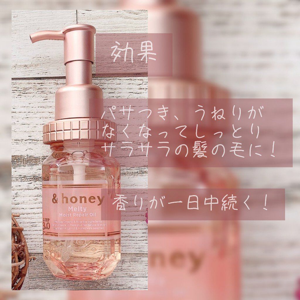 今日は「&honeyMeltyモイストリペアヘアオイル3.0」を皆様にお届けしたいと思います!!話題になりましたよね!!『&honey』パッケージも可愛くて、香りも素敵で、極めつけははちみつ!!最高です✨✨今までたくさんのヘアオイルを試してき...