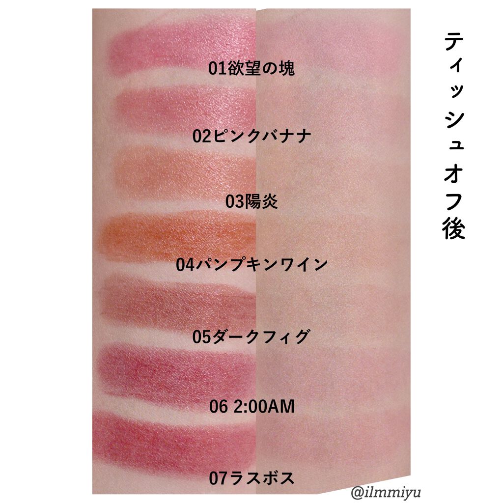 - <01 欲望の塊> テトライソステアリン酸ジペンタエリスリチル、トリ(カプリル酸/カプリン酸)グリセリル、オクチルドデカノール、ラウロイルグルタミン酸ジ(フィトステリル/オクチルドデシル)、ビスアルキル(C16-18)グリセリルウンデシルジメチコン、イソノナン酸イソトリデシル、水添ポリイソブテン、ラウロイルグルタミン酸ジ(オクチルドデシル/フィトステリル/ベヘニル)、パラフィン、合成ワックス、ダイマージリノール酸(フィトステリル/イソステアリル/セチル/ステアリル/ベヘニル)、マイクロクリスタリンワックス、水添マイクロクリスタリンワックス、ヒドロキシステアリン酸エチルヘキシル、トコフェロール、ホホバ種子油、オリーブ果実油、アーモンド油、(エチレン/プロピレン)コポリマー、ポリエチレン、ジメチコン、(+/-)(チタン/酸化チタン)焼結物、マイカ、ラウロイルアスパラギン酸Na、ラウロイルリシン、塩化亜鉛、酸化チタン、酸化鉄、水酸化Al、硫酸Ba、トリイソステアリン酸イソプロピルチタン、酸化スズ、ホウケイ酸(Ca/Al)、合成フルオロフロゴパイト、黄4、黄5、赤104(1)、赤201、赤202 <02 ピンクバナナ> テトライソステアリン酸ジペンタエリスリチル、トリ(カプリル酸/カプリン酸)グリセリル、オクチルドデカノール、ラウロイルグルタミン酸ジ(フィトステリル/オクチルドデシル)、ビスアルキル(C16-18)グリセリルウンデシルジメチコン、イソノナン酸イソトリデシル、水添ポリイソブテン、ラウロイルグルタミン酸ジ(オクチルドデシル/フィトステリル/ベヘニル)、パラフィン、合成ワックス、ダイマージリノール酸(フィトステリル/イソステアリル/セチル/ステアリル/ベヘニル)、マイクロクリスタリンワックス、水添マイクロクリスタリンワックス、ヒドロキシステアリン酸エチルヘキシル、トコフェロール、ホホバ種子油、オリーブ果実油、アーモンド油、(エチレン/プロピレン)コポリマー、ポリエチレン、ジメチコン、(+/-)(チタン/酸化チタン)焼結物、マイカ、ラウロイルアスパラギン酸Na、ラウロイルリシン、塩化亜鉛、酸化チタン、酸化鉄、水酸化Al、硫酸Ba、トリイソステアリン酸イソプロピルチタン、酸化スズ、ホウケイ酸(Ca/Al)、合成フルオロフロゴパイト、黄4、黄5、赤104(1)、赤201、赤202 <03 陽炎> テトライソステアリン酸ジペンタエリスリチル、トリ(カプリル酸/カプリン酸)グリセリル、オクチルドデカノール、ラウロイルグルタミン酸ジ(フィトステリル/オクチルドデシル)、ビスアルキル(C16-18)グリセリルウンデシルジメチコン、イソノナン酸イソトリデシル、水添ポリイソブテン、ラウロイルグルタミン酸ジ(オクチルドデシル/フィトステリル/ベヘニル)、パラフィン、合成ワックス、ダイマージリノール酸(フィトステリル/イソステアリル/セチル/ステアリル/ベヘニル)、マイクロクリスタリンワックス、水添マイクロクリスタリンワックス、ヒドロキシステアリン酸エチルヘキシル、トコフェロール、ホホバ種子油、オリーブ果実油、アーモンド油、(エチレン/プロピレン)コポリマー、ポリエチレン、ジメチコン、(+/-)(チタン/酸化チタン)焼結物、マイカ、ラウロイルアスパラギン酸Na、ラウロイルリシン、塩化亜鉛、酸化チタン、酸化鉄、水酸化Al、硫酸Ba、トリイソステアリン酸イソプロピルチタン、酸化スズ、ホウケイ酸(Ca/Al)、合成フルオロフロゴパイト、黄4、黄5、赤104(1)、赤201、赤202 <04 パンプキンワイン> テトライソステアリン酸ジペンタエリスリチル、トリ(カプリル酸/カプリン酸)グリセリル、オクチルドデカノール、ラウロイルグルタミン酸ジ(フィトステリル/オクチルドデシル)、ビスアルキル(C16-18)グリセリルウンデシルジメチコン、イソノナン酸イソトリデシル、水添ポリイソブテン、ラウロイルグルタミン酸ジ(オクチルドデシル/フィトステリル/ベヘニル)、パラフィン、合成ワックス、ダイマージリノール酸(フィトステリル/イソステアリル/セチル/ステアリル/ベヘニル)、マイクロクリスタリンワックス、水添マイクロクリスタリンワックス、ヒドロキシステアリン酸エチルヘキシル、トコフェロール、ホホバ種子油、オリーブ果実油、アーモンド油、(エチレン/プロピレン)コポリマー、ポリエチレン、ジメチコン、(+/-)(チタン/酸化チタン)焼結物、マイカ、ラウロイルアスパラギン酸Na、ラウロイルリシン、塩化亜鉛、酸化チタン、酸化鉄、水酸化Al、硫酸Ba、トリイソステアリン酸イソプロピルチタン、酸化スズ、ホウケイ酸(Ca/Al)、合成フルオロフロゴパイト、黄4、黄5、赤104(1)、赤201、赤202 <05 ダークフィグ> テトライソステアリン酸ジペンタエリスリチル、トリ(カプリル酸/カプリン酸)グリセリル、オクチルドデカノール、ラウロイルグルタミン酸ジ(フィトステリル/オクチルドデシル)、ビスアルキル(C16-18)グリセリルウンデシルジメチコン、イソノナン酸イソトリデシル、水添ポリイソブテン、ラウロイルグルタミン酸ジ(オクチルドデシル/フィトステリル/ベヘニル)、