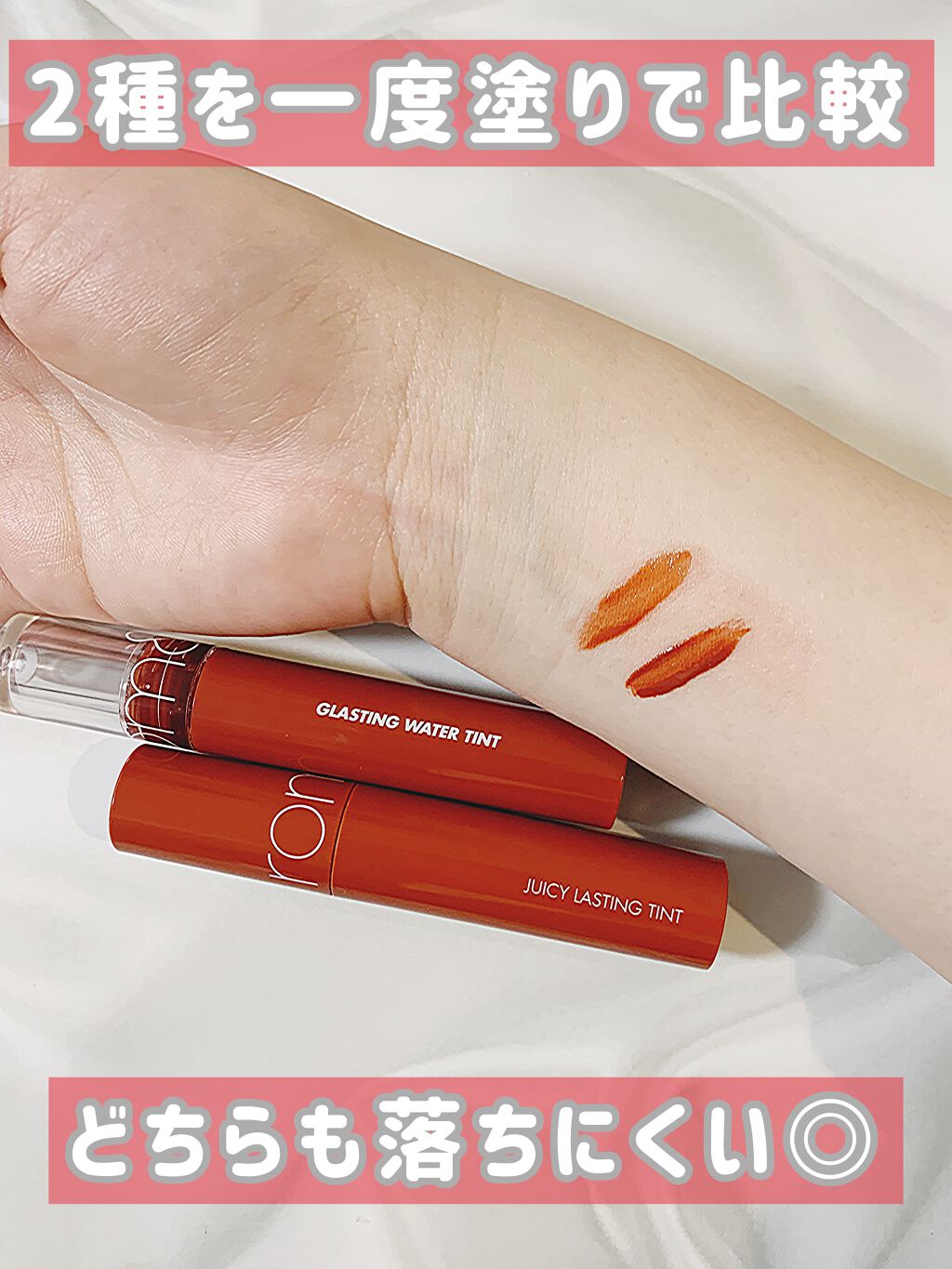 rom&nd♡*ジューシーラスティングティント*グラスティングウォーターティント大人気のティントを比較💎どちらも似ている色で塗り比べしてみました🤍*ジューシーラスティングティント硬すぎず丁度良いテクスチャーで、ご飯を食べても色をキープしてくれ...