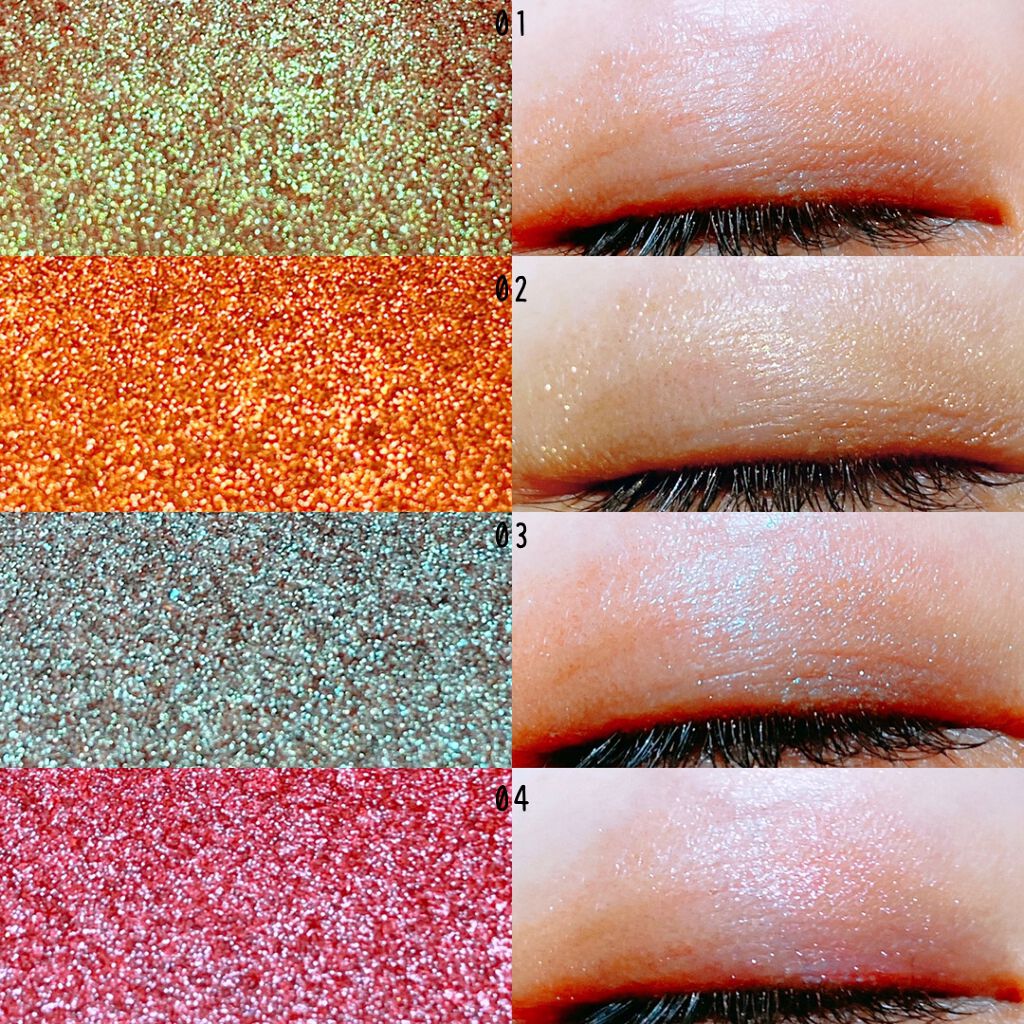 URGLAMオーロラアイシャドウ01オレンジのようなブラウンのようなベースカラーに、グリーンっぽいラメかな?02オレンジのようなブラウンのようなベースカラーに、オレンジ系のラメかな?03ブラウンっぽいベースカラーに、ブルー・グリーン...