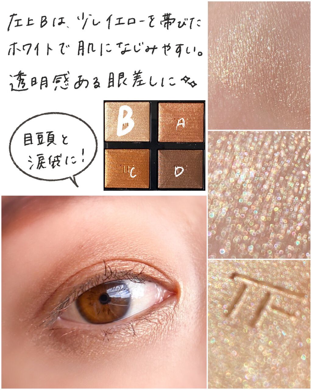 アンプリのベーシック系のカラーの中でもひときわニュートラルな、色味を削いだようなベージュブラウン。 こちらも少し前(7/30)にレビューしているのでそちらもご参考いただけたら🙇♀️ このパレットはベーシックでありながらトレンド感もあるところがお気に入りポイントでして、ちょっとセピアを帯びたようなくすみ感がなんとも言えずお洒落な雰囲気を醸し出してくれます。 というのは全体的に肌に馴染むようなヌーディカラーで構成されたすごくナチュラルなシェードなんだけど、シルバー系のパールが潜んでいたり、少しくすみ感があったりと、甘さを取り除いてクールな仕上がりになるところがめちゃくちゃかっこいいのよ。 ダイヤモンドを彷彿とさせるような大粒のラメの煌めきがたまらなく美しいアイカラーです。 このパレットの好きなところは、マットが主役なところ。絶妙にニュアンスの異なる3色のマットでグラデーションしやすいのがミソです。 パールカラーの入れ方次第で表情が変わるパレットだと思う。