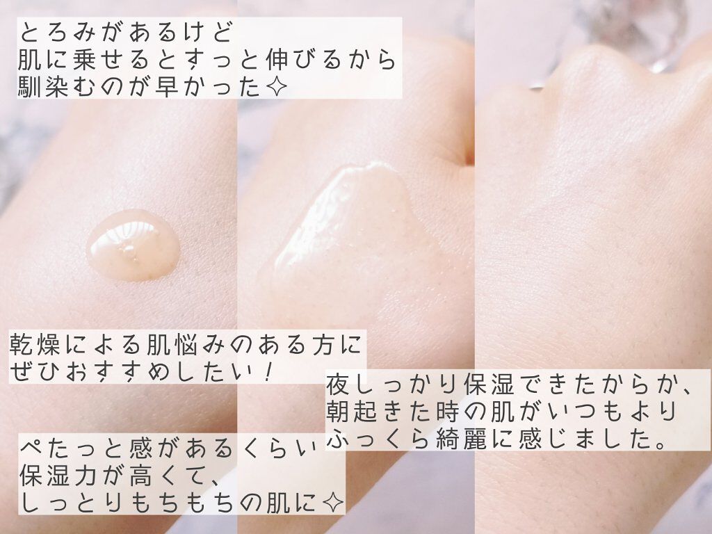 とろっとしたテクスチャー。とろみはあるけど、馴染ませるとサラッとして、ベタつきにくかったです。しっとりして、いつもよりハリがあるように感じました。 昼は乾燥などの外的要因から肌を守り、夜はダメージをケアしてくれるそうです。