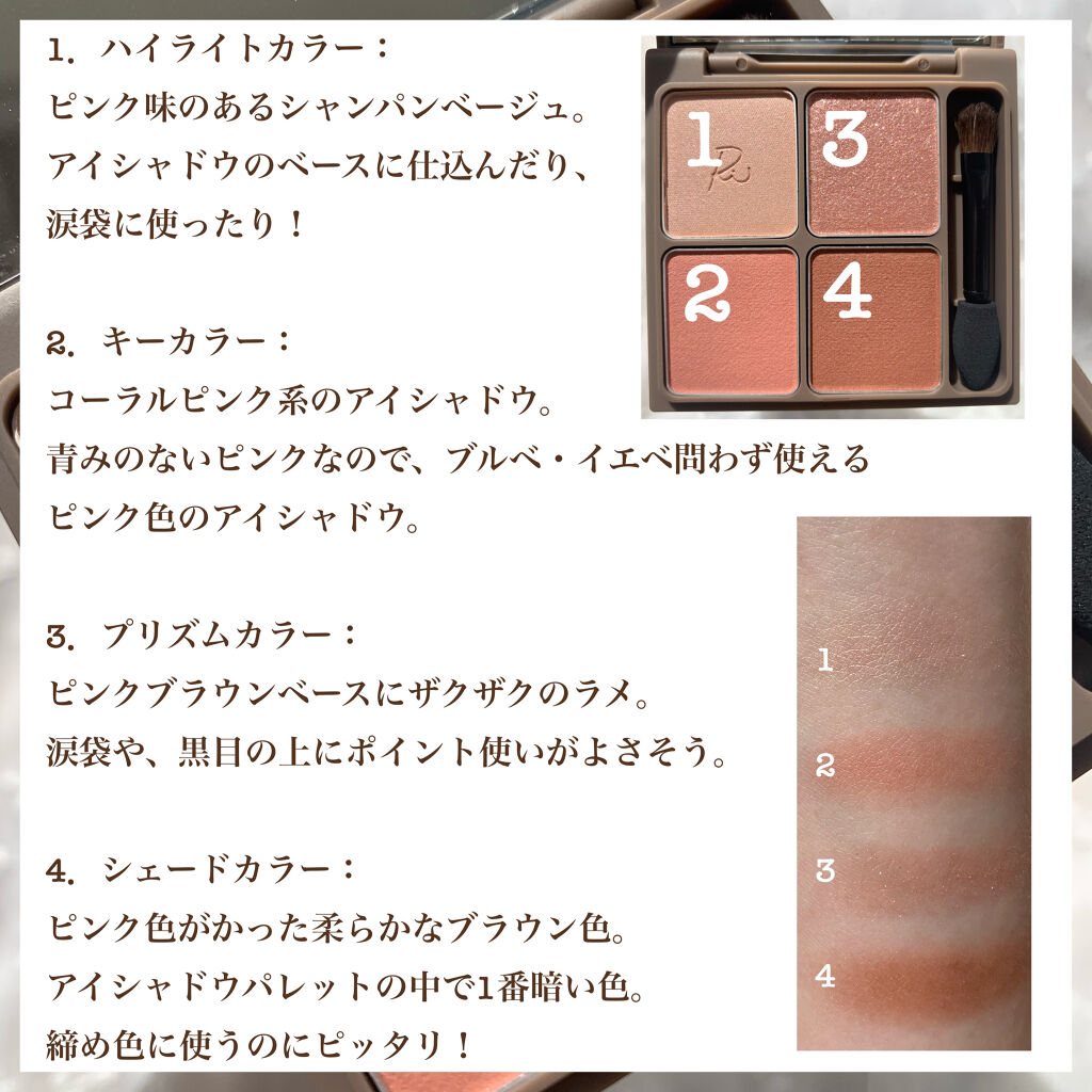 - 2021年3月15日(月)予約販売開始 色×光×質感を1つに詰め込み、毎日のアイメイクのバリエー ションを膨らませる4色のアイシャドウパレット。 ・発色・質感を調整しやすいチップ&ブラシ ふんわり仕上げたいときはブラシ しっかり発色させたいときはチップを その日の気分に合わせたアイメイクが楽しめる ・ 毎日のメイクが楽しくなる4つのカラー ・こだわりの3つの質感 シマー・プリズム・マットのテクスチャー それぞれのカラーがしっかり色づきピタッと密着 ●保湿美容液成分:セラミド・ヒアルロン酸・モモ葉エキス 配合。 ●ミラー・チップ&ブラシ付き。