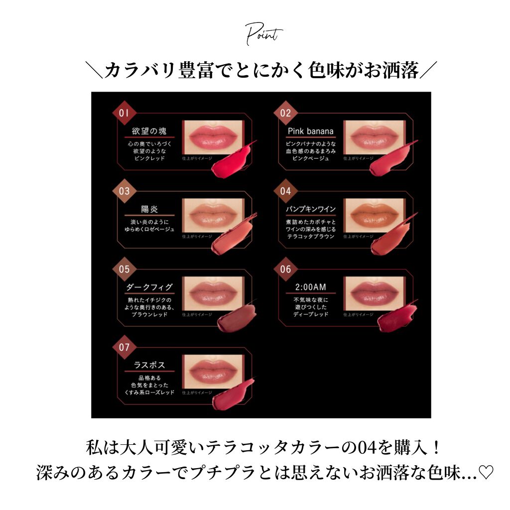 - <01 欲望の塊> テトライソステアリン酸ジペンタエリスリチル、トリ(カプリル酸/カプリン酸)グリセリル、オクチルドデカノール、ラウロイルグルタミン酸ジ(フィトステリル/オクチルドデシル)、ビスアルキル(C16-18)グリセリルウンデシルジメチコン、イソノナン酸イソトリデシル、水添ポリイソブテン、ラウロイルグルタミン酸ジ(オクチルドデシル/フィトステリル/ベヘニル)、パラフィン、合成ワックス、ダイマージリノール酸(フィトステリル/イソステアリル/セチル/ステアリル/ベヘニル)、マイクロクリスタリンワックス、水添マイクロクリスタリンワックス、ヒドロキシステアリン酸エチルヘキシル、トコフェロール、ホホバ種子油、オリーブ果実油、アーモンド油、(エチレン/プロピレン)コポリマー、ポリエチレン、ジメチコン、(+/-)(チタン/酸化チタン)焼結物、マイカ、ラウロイルアスパラギン酸Na、ラウロイルリシン、塩化亜鉛、酸化チタン、酸化鉄、水酸化Al、硫酸Ba、トリイソステアリン酸イソプロピルチタン、酸化スズ、ホウケイ酸(Ca/Al)、合成フルオロフロゴパイト、黄4、黄5、赤104(1)、赤201、赤202 <02 ピンクバナナ> テトライソステアリン酸ジペンタエリスリチル、トリ(カプリル酸/カプリン酸)グリセリル、オクチルドデカノール、ラウロイルグルタミン酸ジ(フィトステリル/オクチルドデシル)、ビスアルキル(C16-18)グリセリルウンデシルジメチコン、イソノナン酸イソトリデシル、水添ポリイソブテン、ラウロイルグルタミン酸ジ(オクチルドデシル/フィトステリル/ベヘニル)、パラフィン、合成ワックス、ダイマージリノール酸(フィトステリル/イソステアリル/セチル/ステアリル/ベヘニル)、マイクロクリスタリンワックス、水添マイクロクリスタリンワックス、ヒドロキシステアリン酸エチルヘキシル、トコフェロール、ホホバ種子油、オリーブ果実油、アーモンド油、(エチレン/プロピレン)コポリマー、ポリエチレン、ジメチコン、(+/-)(チタン/酸化チタン)焼結物、マイカ、ラウロイルアスパラギン酸Na、ラウロイルリシン、塩化亜鉛、酸化チタン、酸化鉄、水酸化Al、硫酸Ba、トリイソステアリン酸イソプロピルチタン、酸化スズ、ホウケイ酸(Ca/Al)、合成フルオロフロゴパイト、黄4、黄5、赤104(1)、赤201、赤202 <03 陽炎> テトライソステアリン酸ジペンタエリスリチル、トリ(カプリル酸/カプリン酸)グリセリル、オクチルドデカノール、ラウロイルグルタミン酸ジ(フィトステリル/オクチルドデシル)、ビスアルキル(C16-18)グリセリルウンデシルジメチコン、イソノナン酸イソトリデシル、水添ポリイソブテン、ラウロイルグルタミン酸ジ(オクチルドデシル/フィトステリル/ベヘニル)、パラフィン、合成ワックス、ダイマージリノール酸(フィトステリル/イソステアリル/セチル/ステアリル/ベヘニル)、マイクロクリスタリンワックス、水添マイクロクリスタリンワックス、ヒドロキシステアリン酸エチルヘキシル、トコフェロール、ホホバ種子油、オリーブ果実油、アーモンド油、(エチレン/プロピレン)コポリマー、ポリエチレン、ジメチコン、(+/-)(チタン/酸化チタン)焼結物、マイカ、ラウロイルアスパラギン酸Na、ラウロイルリシン、塩化亜鉛、酸化チタン、酸化鉄、水酸化Al、硫酸Ba、トリイソステアリン酸イソプロピルチタン、酸化スズ、ホウケイ酸(Ca/Al)、合成フルオロフロゴパイト、黄4、黄5、赤104(1)、赤201、赤202 <04 パンプキンワイン> テトライソステアリン酸ジペンタエリスリチル、トリ(カプリル酸/カプリン酸)グリセリル、オクチルドデカノール、ラウロイルグルタミン酸ジ(フィトステリル/オクチルドデシル)、ビスアルキル(C16-18)グリセリルウンデシルジメチコン、イソノナン酸イソトリデシル、水添ポリイソブテン、ラウロイルグルタミン酸ジ(オクチルドデシル/フィトステリル/ベヘニル)、パラフィン、合成ワックス、ダイマージリノール酸(フィトステリル/イソステアリル/セチル/ステアリル/ベヘニル)、マイクロクリスタリンワックス、水添マイクロクリスタリンワックス、ヒドロキシステアリン酸エチルヘキシル、トコフェロール、ホホバ種子油、オリーブ果実油、アーモンド油、(エチレン/プロピレン)コポリマー、ポリエチレン、ジメチコン、(+/-)(チタン/酸化チタン)焼結物、マイカ、ラウロイルアスパラギン酸Na、ラウロイルリシン、塩化亜鉛、酸化チタン、酸化鉄、水酸化Al、硫酸Ba、トリイソステアリン酸イソプロピルチタン、酸化スズ、ホウケイ酸(Ca/Al)、合成フルオロフロゴパイト、黄4、黄5、赤104(1)、赤201、赤202 <05 ダークフィグ> テトライソステアリン酸ジペンタエリスリチル、トリ(カプリル酸/カプリン酸)グリセリル、オクチルドデカノール、ラウロイルグルタミン酸ジ(フィトステリル/オクチルドデシル)、ビスアルキル(C16-18)グリセリルウンデシルジメチコン、イソノナン酸イソトリデシル、水添ポリイソブテン、ラウロイルグルタミン酸ジ(オクチルドデシル/フィトステリル/ベヘニル)、