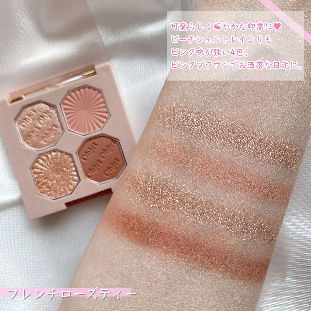 肌馴染みの良いコーラルカラー、締め色が赤みのあるブラウンなので可愛くなり過ぎず、しっかり目元をまとめてくれます◎ ヌーディーなカラーと締め色カラーはマット、メインカラーはほんのりラメ、プラスで楽しめるラメと捨て色なしの4色パレット🎨 爽やかさあふれる肌なじみのよいコーラルで可憐な印象に。