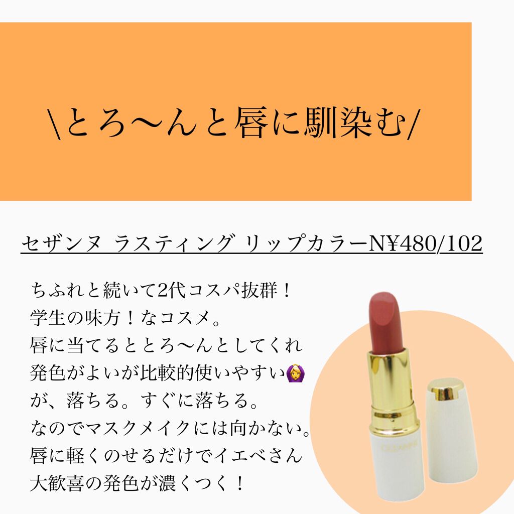 | 口紅・グロス・リップライナーランキング第65位 | ティッシュオフしても色残りしやすく、マスクメイクにおすすめです! | 詳細を見る | |