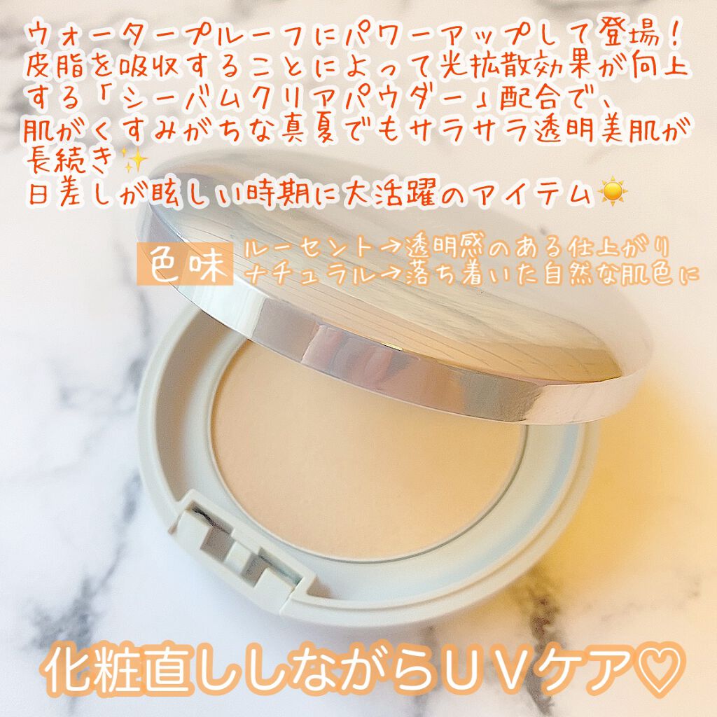 - メイクの上から手を汚さずにUVケアができる、パウダータイプの顔用サンスクリーンです。 プレストタイプなので持ち運びOK。いつでもどこでもササッとUV対策とメイク直しが同時にできる、時短アイテムです。 皮脂をしっかり吸収し光拡散力がアップするパウダーにより、時間が経ってもくすみにくい肌に。 さらに粉体同士を密着させるUVカット剤を配合。隙間なく肌に密着し、“素肌のようななめらかな軽さ”と“高いUVカット効果”の両立を叶えました。パウダーならではの軽いつけ心地で、日焼け止めが苦手な方にもおすすめです。 汗・水に強いウォータープルーフ処方なので、日常使いはもちろん、レジャーにも大活躍します。 ●酸化しやすい油分不使用●シアーフィットプロテクターEX*1配合=紫外線〔UV-A・B〕散乱剤、紫外線〔UV-A・B〕吸収剤●シーバムクリアパウダー*2配合=化粧持ち向上粉体●ローズマリー葉エキス配合=植物性保湿成分 ※ウォータープルーフテスト済 ※サンカット指数=SPF50+/PA++++ *1 マイカ、ビスエチルヘキシルオキシフェノールメトキシフェニルトリアジン、アルミナ、トリメトキシシリルジメチコン、酸化チタン *2 酸化亜鉛 ●無香料 ※アレルギーテスト済=全ての方にアレルギーが起こらないということではありません。
