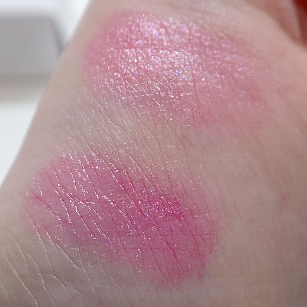 チークポップ持ってる人なら分かると思いますが、パール感は強め。 指で濃いめにつけてるので実際ブラシにとってつけるともっと薄めでモーヴカラー。 白っぽいパールなので見た目より明るめの発色。