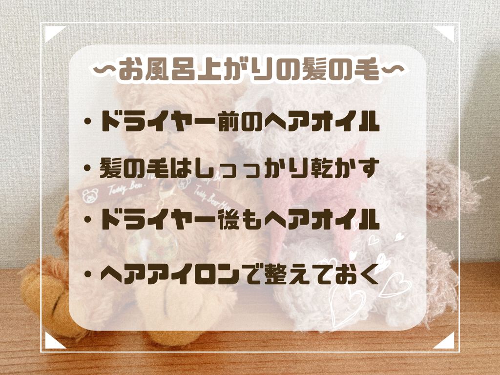 シャンプーやドライヤーの仕方、ヘアケアでよりサラサラつやつやな髪になれます!! 髪の傷みが大きく影響しているので、そこはケアしていかなければ!!と思って頑張っています! ・キューティクルを整える・髪を傷めない・しっかりケアする 髪の毛を「熱・摩擦」からは守りましょう!