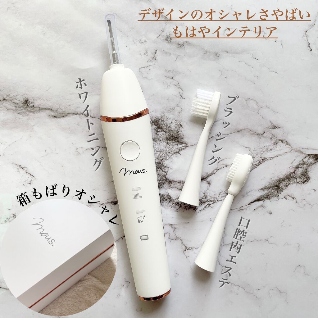 - 1台3役「①音波歯ブラシ+②ホワイトニング*+③美顔器」 ①専用歯ブラシをセットすれば毎分24,000~36,000回の音波振動のブラッシングで歯と歯茎の間の歯垢除去。ブラシ裏の舌用ブラシが舌苔除去にも。 ②金属ヘッドの超音波スクレイパーは毎分240万回の超音波がヤニ・ワイン・コーヒーなどの着色汚れ除去。 ③専用シリコンブラシをセットすれば、口腔内美顔器。防水・充電式。 *歯の汚れをはがして除去する事