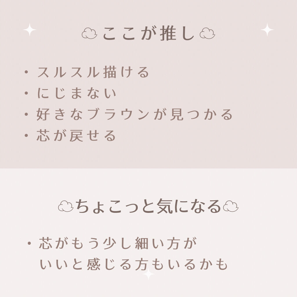 抜け感のあるニュアンスカラーだから、下瞼のラインもきつくなりすぎないところが◎ なめらかな描きごこちで、2mmの芯が太すぎず細すぎずで折れにくいよ。 繰り出しても戻るタイプなのが便利。