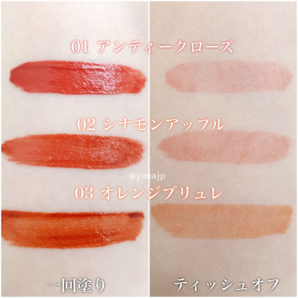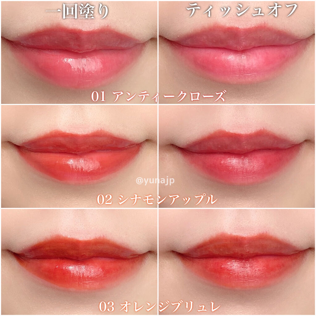 - ツヤ膜でLIPカラーを閉じ込める 塗ってから「5分」でかわいい唇完成♥ツヤがあふれ出るオイルinウォーターティント 水に対して約2倍のオイル成分を配合した「オイルinウォーター処方」 時間経過でツヤ膜がじゅわ~っとあふれ出し、 まるでグロスを重ねたような仕上がりに。みずみずしいツヤ感が持続します。 塗布後、時間経過(※)で色が定着して食べても飲んでも血色長持ち。 (※定着には個人差があります。弊社5分推奨) 高密着で唇に溶け込むように色づきます。 コップやペットボトルへの色移りがしにくくなります。