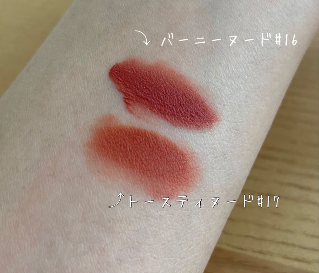 ‧✧̣̥̇‧rom&ndゼロベルベットティント‧✧̣̥̇‧バーニーヌード♯16トースティヌード♯17私の唇は薄い色ではなく濃いめです!それでもかなり綺麗に発色してくれて、ティッシュOFFでも残ります🥰マスクに付きづらいのもありがたいです!トー...