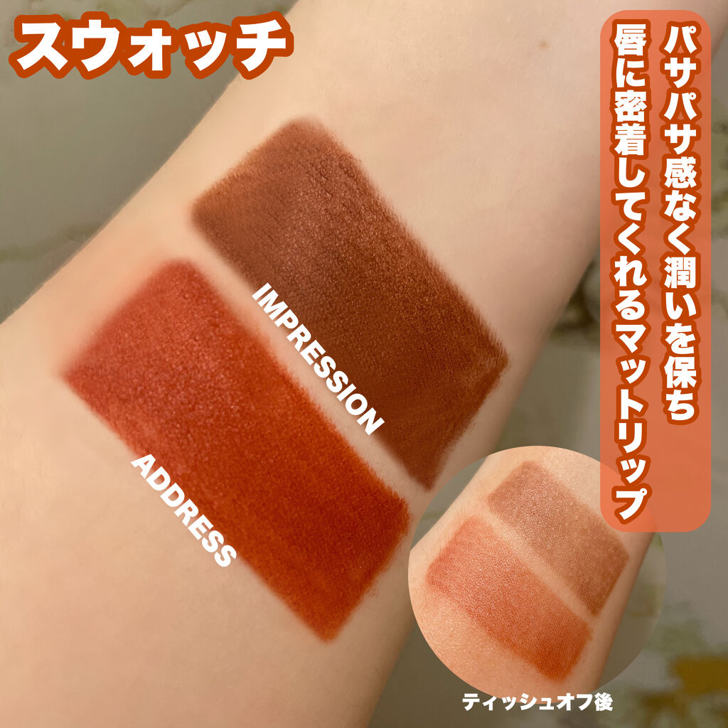 こちらは先月に登場したばかりのティントでマットタイプです✨ このカラー可愛すぎて塗った時に思わず「かわいいー!!!」と声が出てしまいました 塗ってみると、赤強めのブラウンで顔の色がパッとトーンアップするような感じでくすみを飛ばしてくれるような感じがしました☺️ マットリップなので、塗る前に保湿をしっかりしてあげるといいと思います!塗ったあとに…唇の縁をぼかして塗るようにしてます!! そしてパッケージもめちゃめちゃかわいいんですマットの質感で #パケ買い しそうな感じです🌟