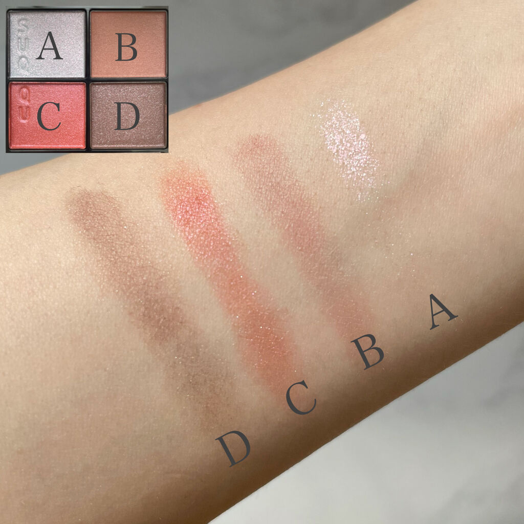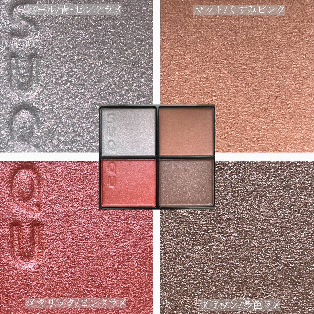 スック冬限定の赤みモーヴシャドウただのブラウン…じゃ終わらないところがさすがSUQQU。赤みやくすみ、まろやかさも備わって目元に乗せるだけで一気におしゃれさアップ!左上のラメはピンクラメで可愛い!!どことなくピンクみも感じられて暖かみのあるメ...