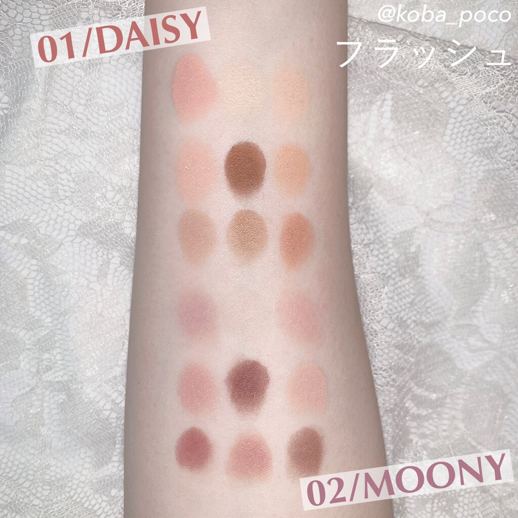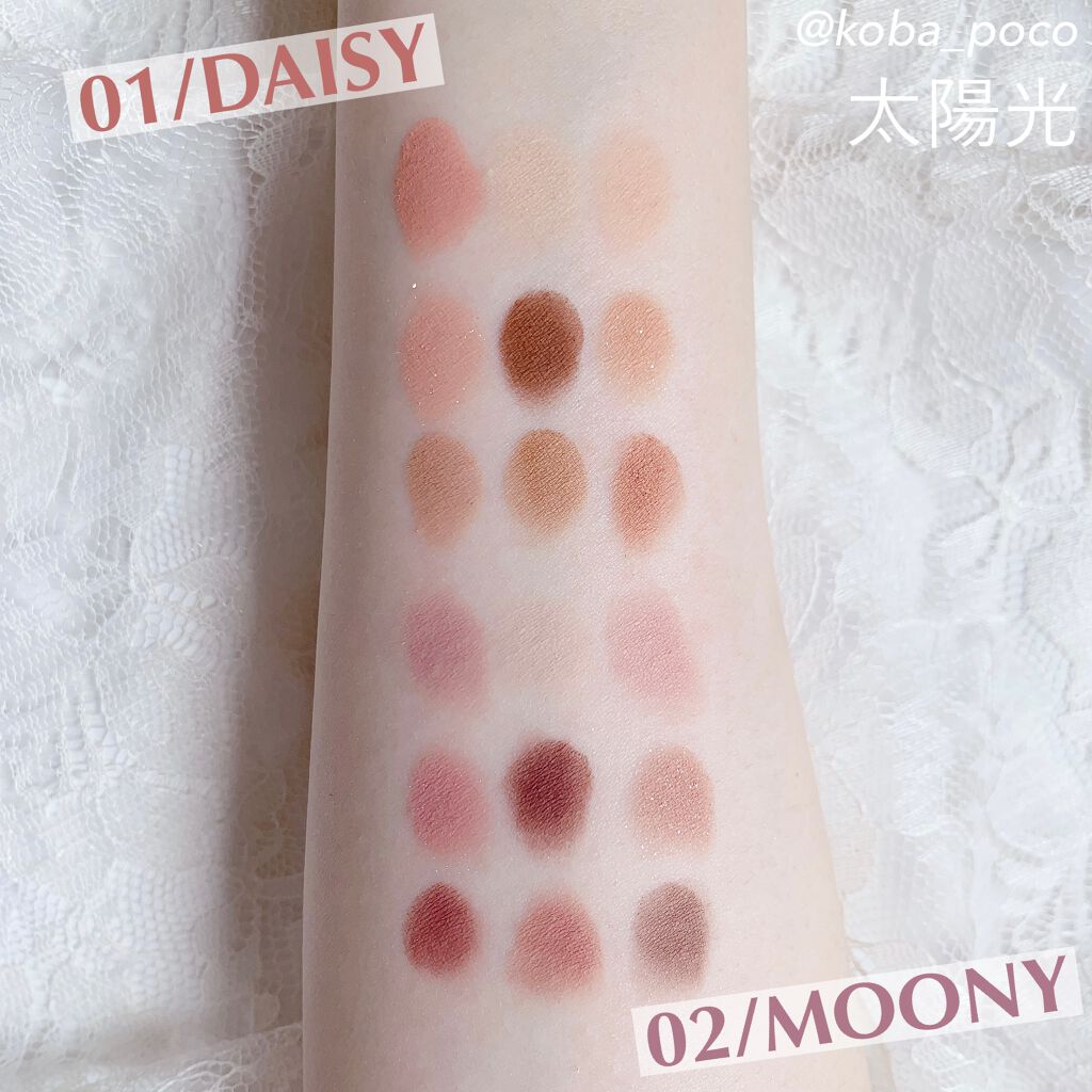 ふんわり優しい発色のアイシャドウパレット🎨 陰影カラー、ラメ、ベースカラーのバランスが良く配置されていて使いやすくてお気に入り◎ 白みピンクだから、優しい印象になる気がします。陰影カラーが入っているので腫れぼったい印象になりにくいと感じました!! 高発色が好きな方より、ほんのり発色が好きな方におすすめラメがギラギラせず、繊細なキラキラで可愛いです👾