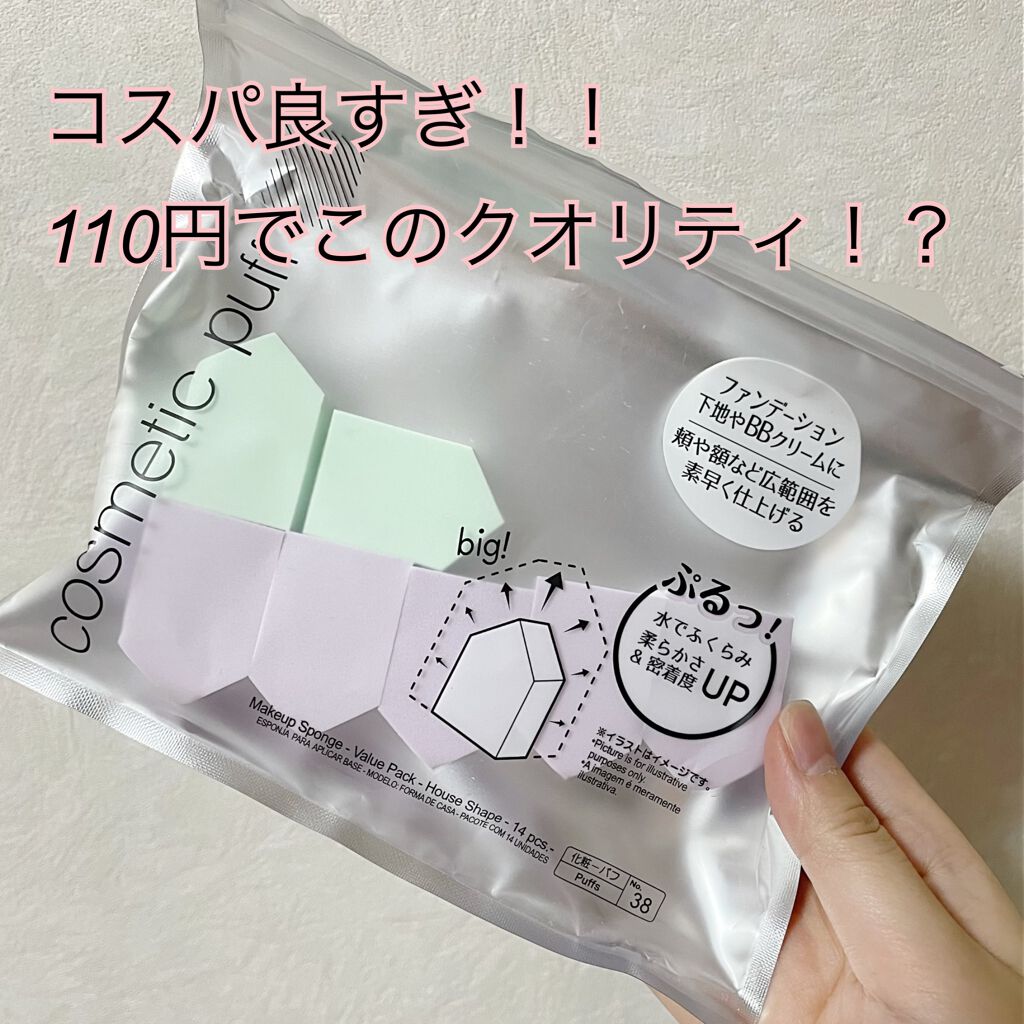 DAISOメイクアップスポンジバリューパックハウス型14個ダイヤモンド型15個それぞれ¥110ベースメイクは指で塗ることが多かったんだけど、これを使うと圧倒的に早く綺麗に仕上がるからついつい買っちゃう✨ちなみに私は水を含ませてプルプルにして使...