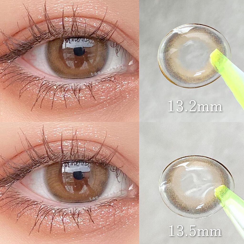 ぼやっとした太めのフチから、ブラウンがじゅわっと広がるような可愛いデザイン。 装着してみると、暖かみがあるのに透明感が出るようなナチュラルで柔らかい印象の目元に。 着色直径も13.2mmと小さめなので、ナチュラルでぼんやりとしたレンズがお好きな方に🤎