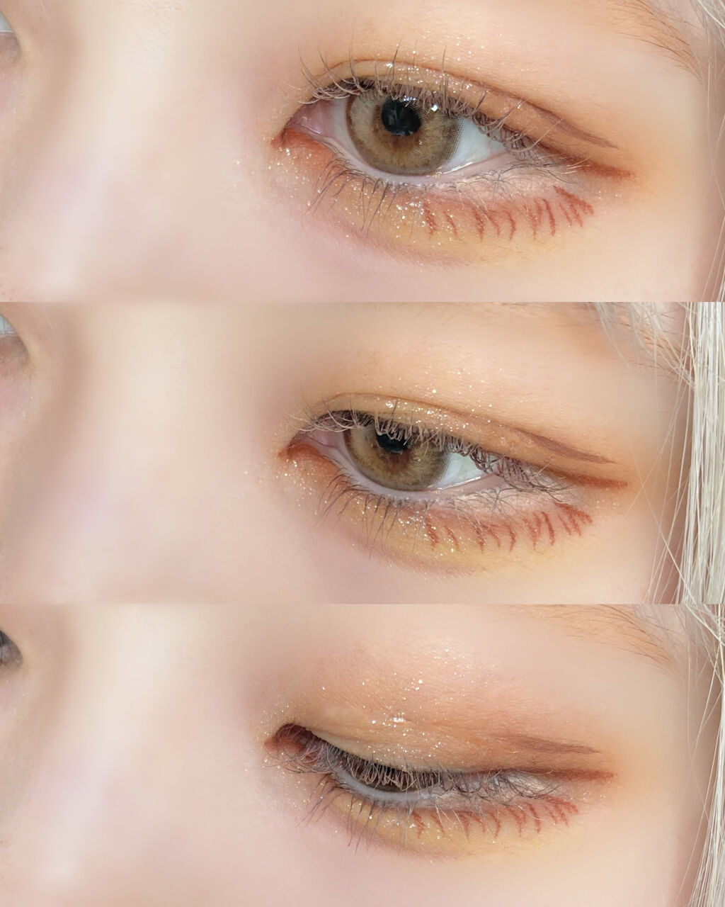 アイシャドウをグラデーションにするときに濃淡に気をつける。 アイラインはぶつっと途切れさせない! マスカラの色も重要で、ブラウンのマスカラを普段使っている方は少し赤みのあるブラウンマスカラを使ってみると、目元に自然な血色感がでてとってもおすすめです!