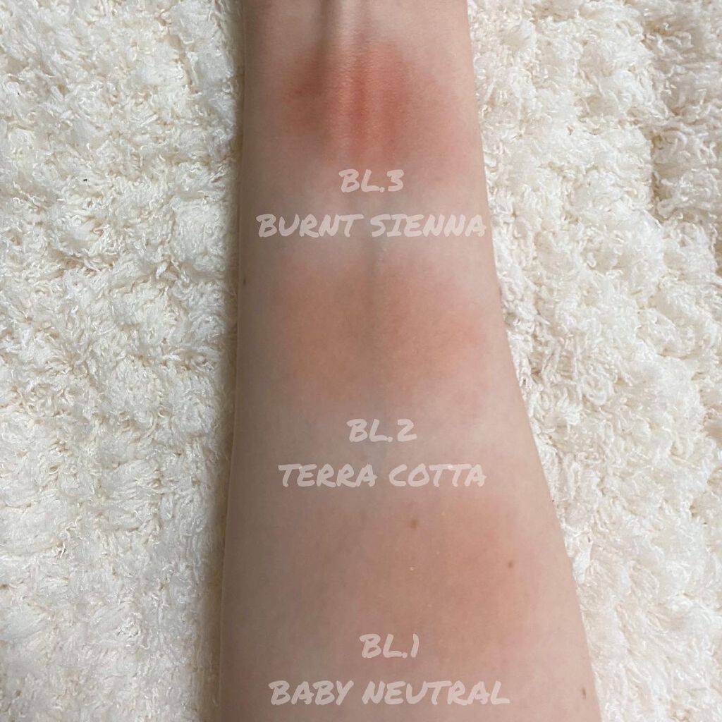 - BL1. ベビーナチュラル タルク, マイカ, シリカ, ナイロン-12, 酸化チタン, ステアロイルオキシステアリン酸オクチルドデシル, フェニルトリメチコン, リンゴ酸ジイソステアリル, ヘキサ(ヒドロキシステアリン酸/ステアリン酸/ロジン酸)ジペンタエリスリチル, ミリスチン酸マグネシウム, ステアリン酸マグネシウム, メチルプロパンジオール, トリ(カプリル酸/カプリン酸)グリセリル, メチコン, プロパンジオール, トリエトキシカプリリルシラン, ジメチコノールエステル, ジメチコン, ラウロイルリシン, 精製水, 赤酸化鉄, 黄酸化鉄, マンガンバイオレット, 黒酸化鉄 BL2. テラコッタ タルク, マイカ, メタクリル酸メチルクロスポリマー, ラウリン酸ヘキシル, ナイロン-12, 酸化チタン, ステアロイルオキシステアリン酸オクチルドデシル, 赤酸化鉄, ジメチコン, ミリスチン酸マグネシウム, マンガンバイオレット, 1,2-ヘキサンジオール, 黄酸化鉄, トリエトキシカプリリルシラン, 水酸化アルミニウム, カプリン酸グリセリル, グンジョウバイオレット, 赤226, メチコン BL3. バーントシエナ タルク, ナイロン-12, マイカ, メタクリル酸メチルクロスポリマー, ラウリン酸ヘキシル, リンゴ酸ジイソステアリル, エチレンアクリレートコポリマー, ステアロイルオキシステアリン酸オクチルドデシル, ジメチコン, 黄酸化鉄, ミリスチン酸マグネシウム, 1,2-ヘキサンジオール, トリエトキシカプリリルシラン, 赤酸化鉄, 黒酸化鉄, カプリン酸グリセリル, 水酸化アルミニウム, 赤226