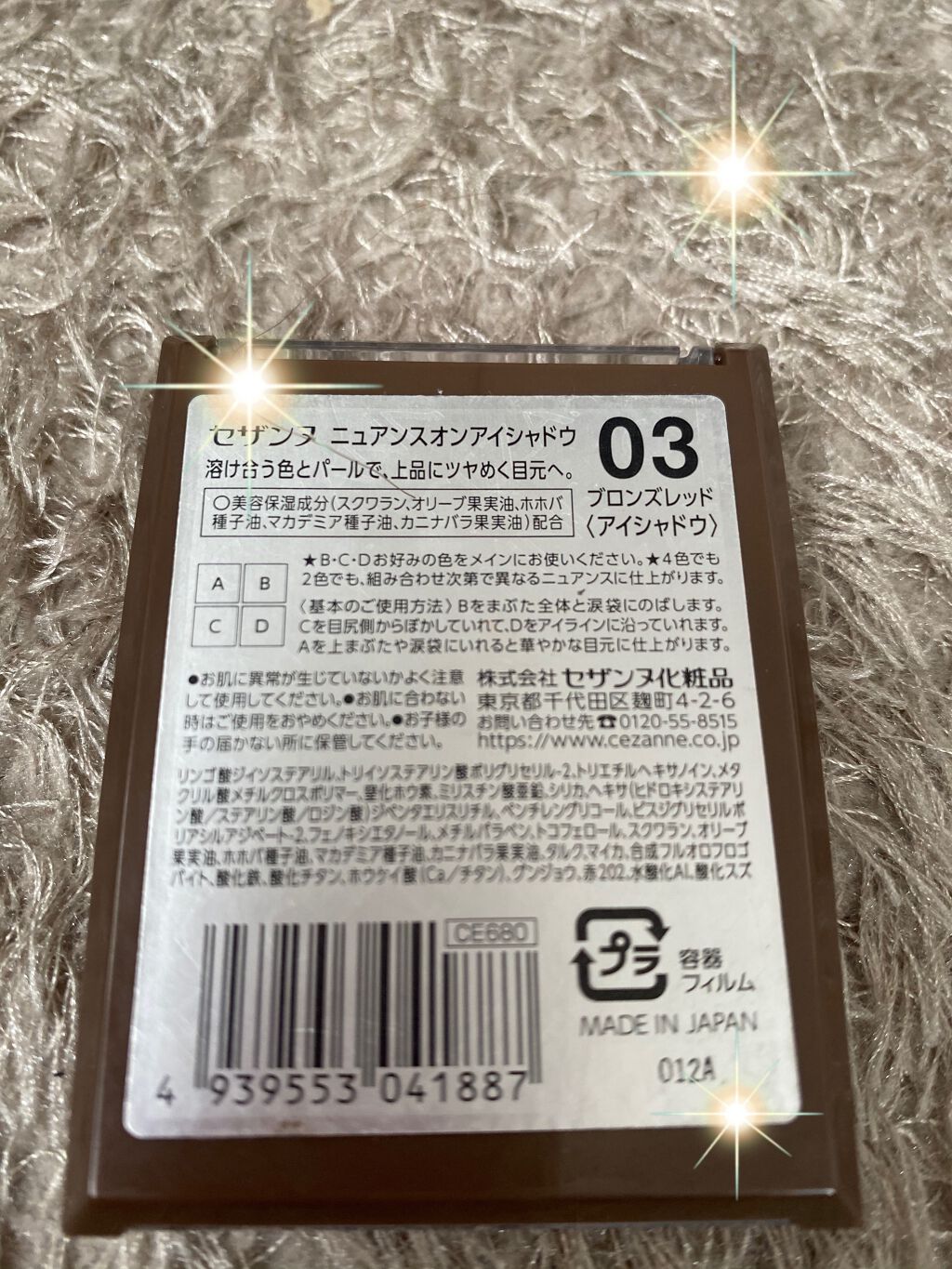 - <01 ウォームコーラル> リンゴ酸ジイソステアリル、トリイソステアリン酸ポリグリセリル-2、トリエチルヘキサノイン、メタクリル酸メチルクロスポリマー、窒化ホウ素、ミリスチン酸亜鉛、シリカ、ヘキサ(ヒドロキシステアリン酸/ステアリン酸/ロジン酸)ジペンタエリスリチル、ペンチレングリコール、ビスジグリセリルポリアシルアジペート-2、フェノキシエタノール、メチルパラベン、トコフェロール、スクワラン、オリーブ果実油、ホホバ種子油、マカデミア種子油、カニナバラ果実油、タルク、マイカ、合成フルオロフロゴパイト、酸化チタン、酸化鉄、ホウケイ酸(Ca/チタン)、酸化スズ、赤202、水酸化Al <02 ローズクォーツ> リンゴ酸ジイソステアリル、トリイソステアリン酸ポリグリセリル-2、トリエチルヘキサノイン、メタクリル酸メチルクロスポリマー、窒化ホウ素、ミリスチン酸亜鉛、シリカ、ヘキサ(ヒドロキシステアリン酸/ステアリン酸/ロジン酸)ジペンタエリスリチル、ペンチレングリコール、ビスジグリセリルポリアシルアジペート-2、フェノキシエタノール、メチルパラベン、トコフェロール、スクワラン、オリーブ果実油、ホホバ種子油、マカデミア種子油、カニナバラ果実油、タルク、合成フルオロフロゴパイト、マイカ、酸化チタン、酸化鉄、ホウケイ酸(Ca/チタン)、グンジョウ、赤202、酸化スズ、赤226、黄4、水酸化Al、マンガンバイオレット <03 ブロンズレッド> リンゴ酸ジイソステアリル、トリイソステアリン酸ポリグリセリル-2、トリエチルヘキサノイン、メタクリル酸メチルクロスポリマー、窒化ホウ素、ミリスチン酸亜鉛、シリカ、ヘキサ(ヒドロキシステアリン酸/ステアリン酸/ロジン酸)ジペンタエリスリチル、ペンチレングリコール、ビスジグリセリルポリアシルアジペート-2、フェノキシエタノール、メチルパラベン、トコフェロール、スクワラン、オリーブ果実油、ホホバ種子油、マカデミア種子油、カニナバラ果実油、タルク、マイカ、合成フルオロフロゴパイト、酸化鉄、酸化チタン、ホウケイ酸(Ca/チタン)、グンジョウ、赤202、水酸化Al、酸化スズ <04 キャメルブラウン> リンゴ酸ジイソステアリル、トリイソステアリン酸ポリグリセリル-2、トリエチルヘキサノイン、メタクリル酸メチルクロスポリマー、窒化ホウ素、ミリスチン酸亜鉛、シリカ、ヘキサ(ヒドロキシステアリン酸/ステアリン酸/ロジン酸)ジペンタエリスリチル、ペンチレングリコール、ビスジグリセリルポリアシルアジペート-2、フェノキシエタノール、メチルパラベン、トコフェロール、スクワラン、オリーブ果実油、ホホバ種子油、マカデミア種子油、カニナバラ果実油、タルク、マイカ、合成フルオロフロゴパイト、酸化鉄、酸化チタン、ホウケイ酸(Ca/チタン)、赤226、酸化スズ、水酸化Al
