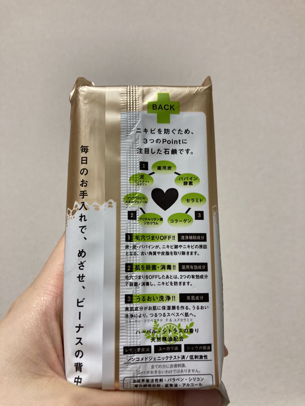 - 医薬部外品 めざせビーナスの背中!炭泥配合の薬用泡で、ニキビを3Stepケア! ニキビの出来かたに注目し、しっかりケアする炭泥配合の薬用石けんです。 ハーバル・シトラスが香るモコモコ泡で、ニキビをくり返さない肌へ。
