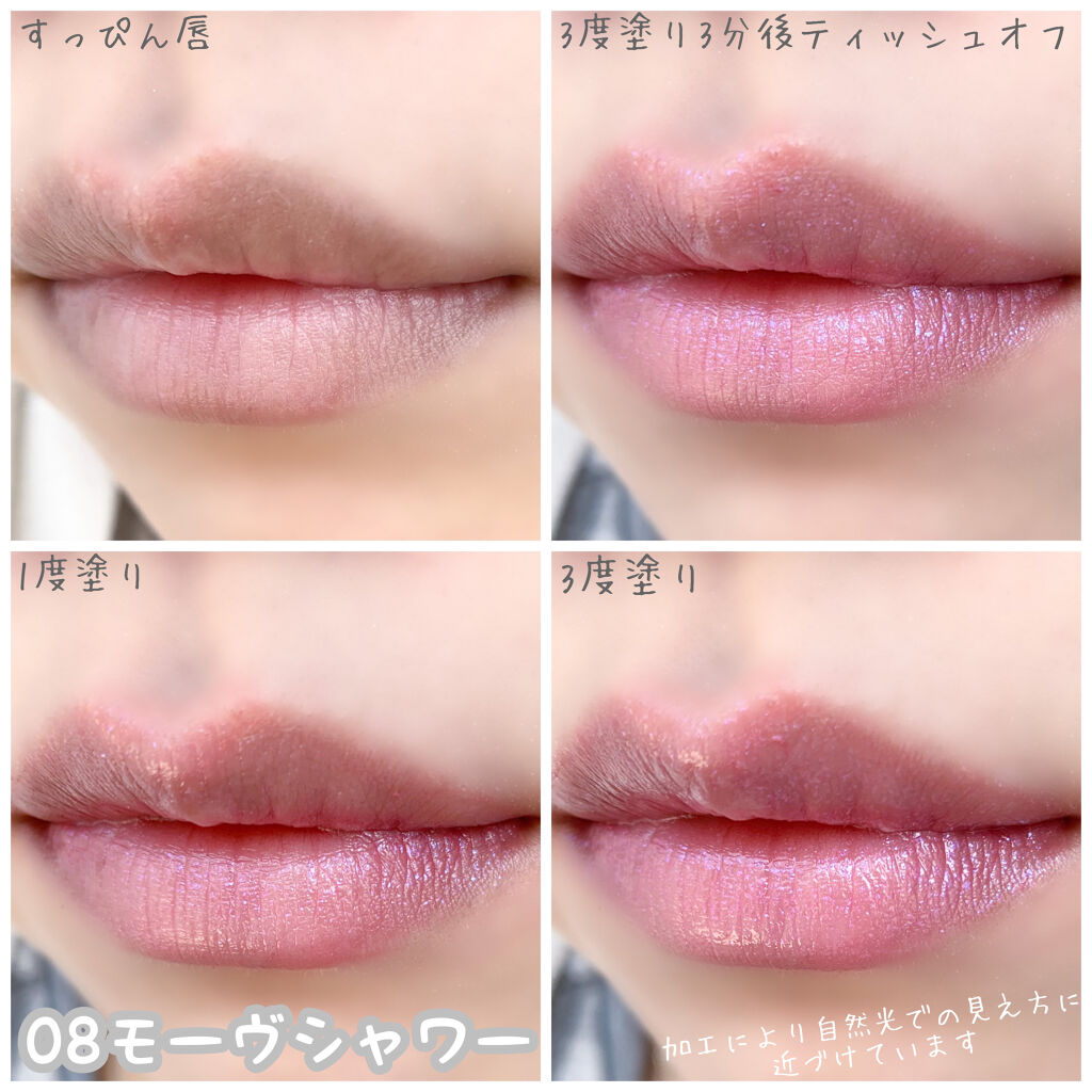 色は紫が入ってるような、淡いピンク色で青み寄りのピンクメイクをする時に凄く合います💕 青ラメ伝わりますかね?他のラメが入ってないリプモンと比べると、ツヤツヤした唇に見える気がしました。 ティッシュオフで擦っても中々青ラメが取れなかったです。