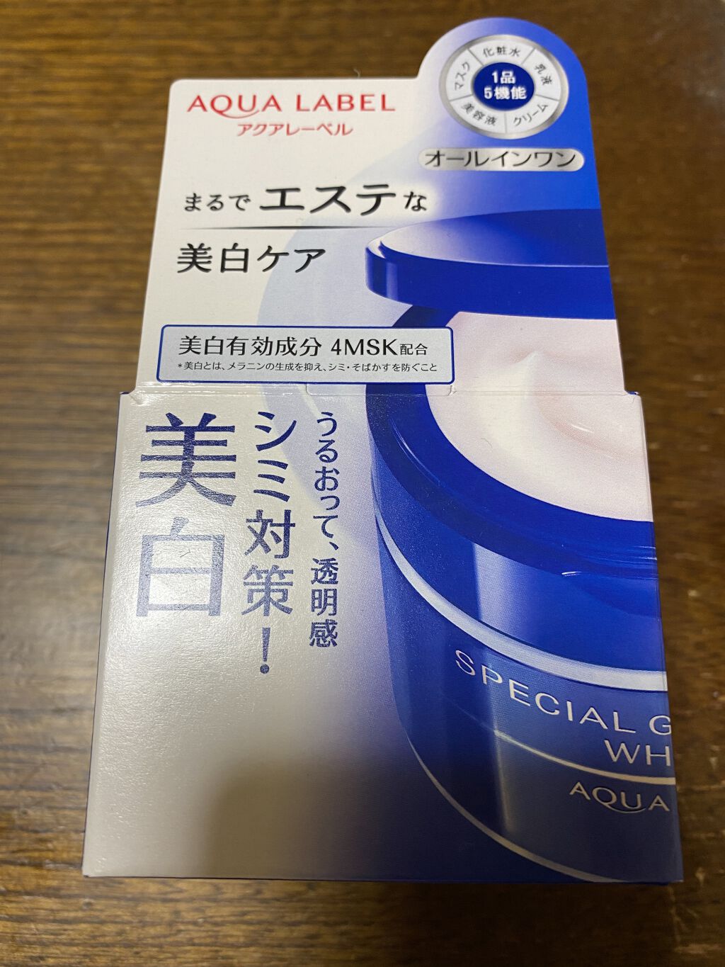 - 'まるでエステな美白ケア' うるおって、透明感 シミ対策!薬用濃密ジェルクリーム ○1品5機能(化粧水、乳液、クリーム、美容液、マスク)の効果をもつ高機能オールインワンジェルクリームです。 ○美白有効成分4MSK※2 配合 ※2 4-メトキシサリチル酸カリウム塩 メラニンの生成を抑え、シミ・そばかすを防ぎます。 ○'まるでエステな美白ケア'を叶えるトリプルエフェクト処方を搭載。使うたびに心地よく、まるでエステ気分を味わえます。 ○濃密なジェルクリームが、肌にとけ込むようにぐんぐんなじみます。 ○うるおって、透明感のある肌に導きます。 ○ハリと透明感のための美肌必須成分チャージアミノ酸WH※3 配合 ※3 (うるおい保持成分) D-グルタミン酸、DL-アラニン、DL-メチオニン ○Wヒアルロン酸配合 (保湿)アセチル化ヒアルロン酸Na、ヒアルロン酸Na ○コラーゲンGL配合 (保湿)水溶性コラーゲン、グリセリン 〇肌柔軟成分 紅茶エキス配合 〇ハーバルローズの優しい香りです。 ○アレルギーテスト済み (全てのかたにアレルギーが起きないというわけではありません。) 医薬部外品