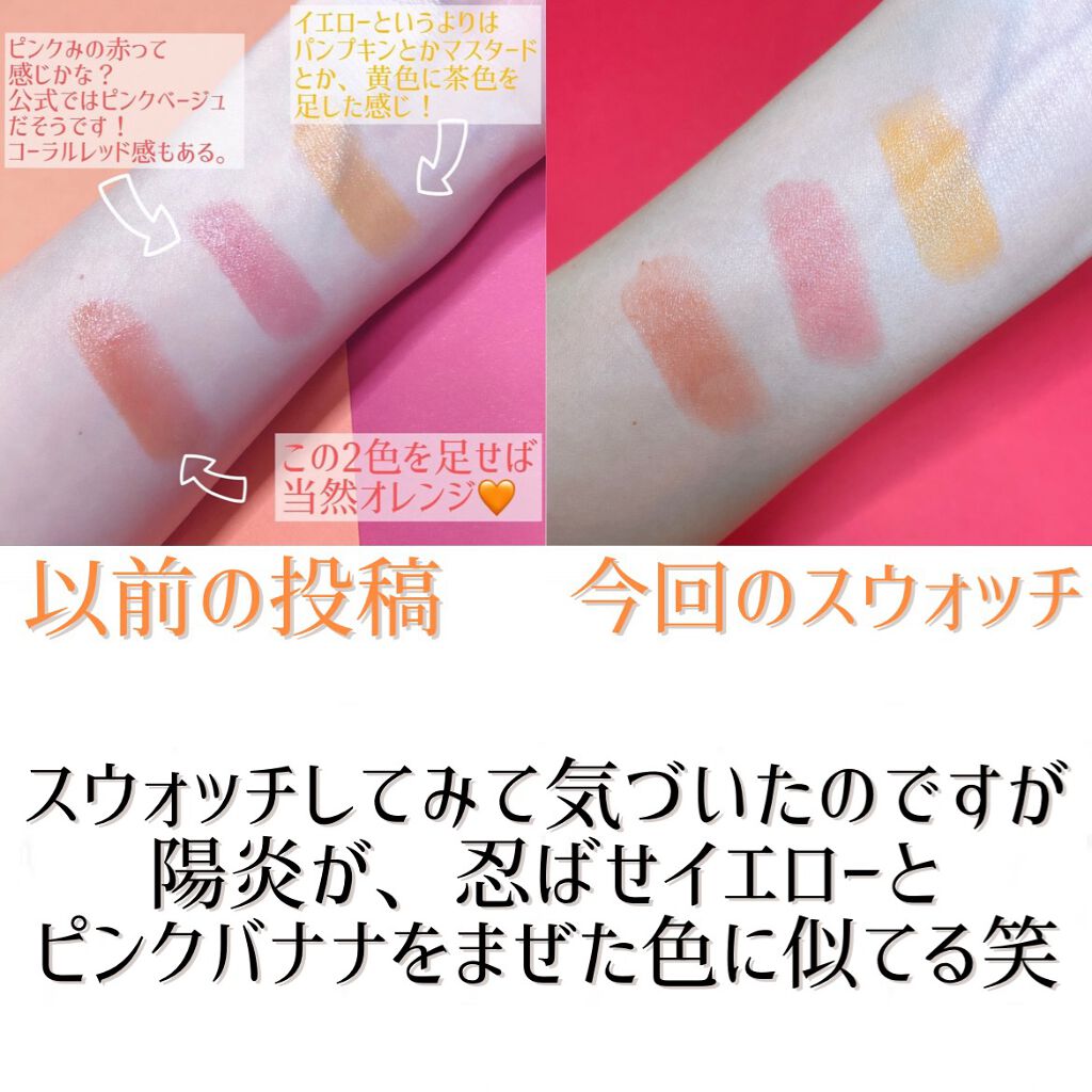 - <01 欲望の塊> テトライソステアリン酸ジペンタエリスリチル、トリ(カプリル酸/カプリン酸)グリセリル、オクチルドデカノール、ラウロイルグルタミン酸ジ(フィトステリル/オクチルドデシル)、ビスアルキル(C16-18)グリセリルウンデシルジメチコン、イソノナン酸イソトリデシル、水添ポリイソブテン、ラウロイルグルタミン酸ジ(オクチルドデシル/フィトステリル/ベヘニル)、パラフィン、合成ワックス、ダイマージリノール酸(フィトステリル/イソステアリル/セチル/ステアリル/ベヘニル)、マイクロクリスタリンワックス、水添マイクロクリスタリンワックス、ヒドロキシステアリン酸エチルヘキシル、トコフェロール、ホホバ種子油、オリーブ果実油、アーモンド油、(エチレン/プロピレン)コポリマー、ポリエチレン、ジメチコン、(+/-)(チタン/酸化チタン)焼結物、マイカ、ラウロイルアスパラギン酸Na、ラウロイルリシン、塩化亜鉛、酸化チタン、酸化鉄、水酸化Al、硫酸Ba、トリイソステアリン酸イソプロピルチタン、酸化スズ、ホウケイ酸(Ca/Al)、合成フルオロフロゴパイト、黄4、黄5、赤104(1)、赤201、赤202 <02 ピンクバナナ> テトライソステアリン酸ジペンタエリスリチル、トリ(カプリル酸/カプリン酸)グリセリル、オクチルドデカノール、ラウロイルグルタミン酸ジ(フィトステリル/オクチルドデシル)、ビスアルキル(C16-18)グリセリルウンデシルジメチコン、イソノナン酸イソトリデシル、水添ポリイソブテン、ラウロイルグルタミン酸ジ(オクチルドデシル/フィトステリル/ベヘニル)、パラフィン、合成ワックス、ダイマージリノール酸(フィトステリル/イソステアリル/セチル/ステアリル/ベヘニル)、マイクロクリスタリンワックス、水添マイクロクリスタリンワックス、ヒドロキシステアリン酸エチルヘキシル、トコフェロール、ホホバ種子油、オリーブ果実油、アーモンド油、(エチレン/プロピレン)コポリマー、ポリエチレン、ジメチコン、(+/-)(チタン/酸化チタン)焼結物、マイカ、ラウロイルアスパラギン酸Na、ラウロイルリシン、塩化亜鉛、酸化チタン、酸化鉄、水酸化Al、硫酸Ba、トリイソステアリン酸イソプロピルチタン、酸化スズ、ホウケイ酸(Ca/Al)、合成フルオロフロゴパイト、黄4、黄5、赤104(1)、赤201、赤202 <03 陽炎> テトライソステアリン酸ジペンタエリスリチル、トリ(カプリル酸/カプリン酸)グリセリル、オクチルドデカノール、ラウロイルグルタミン酸ジ(フィトステリル/オクチルドデシル)、ビスアルキル(C16-18)グリセリルウンデシルジメチコン、イソノナン酸イソトリデシル、水添ポリイソブテン、ラウロイルグルタミン酸ジ(オクチルドデシル/フィトステリル/ベヘニル)、パラフィン、合成ワックス、ダイマージリノール酸(フィトステリル/イソステアリル/セチル/ステアリル/ベヘニル)、マイクロクリスタリンワックス、水添マイクロクリスタリンワックス、ヒドロキシステアリン酸エチルヘキシル、トコフェロール、ホホバ種子油、オリーブ果実油、アーモンド油、(エチレン/プロピレン)コポリマー、ポリエチレン、ジメチコン、(+/-)(チタン/酸化チタン)焼結物、マイカ、ラウロイルアスパラギン酸Na、ラウロイルリシン、塩化亜鉛、酸化チタン、酸化鉄、水酸化Al、硫酸Ba、トリイソステアリン酸イソプロピルチタン、酸化スズ、ホウケイ酸(Ca/Al)、合成フルオロフロゴパイト、黄4、黄5、赤104(1)、赤201、赤202 <04 パンプキンワイン> テトライソステアリン酸ジペンタエリスリチル、トリ(カプリル酸/カプリン酸)グリセリル、オクチルドデカノール、ラウロイルグルタミン酸ジ(フィトステリル/オクチルドデシル)、ビスアルキル(C16-18)グリセリルウンデシルジメチコン、イソノナン酸イソトリデシル、水添ポリイソブテン、ラウロイルグルタミン酸ジ(オクチルドデシル/フィトステリル/ベヘニル)、パラフィン、合成ワックス、ダイマージリノール酸(フィトステリル/イソステアリル/セチル/ステアリル/ベヘニル)、マイクロクリスタリンワックス、水添マイクロクリスタリンワックス、ヒドロキシステアリン酸エチルヘキシル、トコフェロール、ホホバ種子油、オリーブ果実油、アーモンド油、(エチレン/プロピレン)コポリマー、ポリエチレン、ジメチコン、(+/-)(チタン/酸化チタン)焼結物、マイカ、ラウロイルアスパラギン酸Na、ラウロイルリシン、塩化亜鉛、酸化チタン、酸化鉄、水酸化Al、硫酸Ba、トリイソステアリン酸イソプロピルチタン、酸化スズ、ホウケイ酸(Ca/Al)、合成フルオロフロゴパイト、黄4、黄5、赤104(1)、赤201、赤202 <05 ダークフィグ> テトライソステアリン酸ジペンタエリスリチル、トリ(カプリル酸/カプリン酸)グリセリル、オクチルドデカノール、ラウロイルグルタミン酸ジ(フィトステリル/オクチルドデシル)、ビスアルキル(C16-18)グリセリルウンデシルジメチコン、イソノナン酸イソトリデシル、水添ポリイソブテン、ラウロイルグルタミン酸ジ(オクチルドデシル/フィトステリル/ベヘニル)、