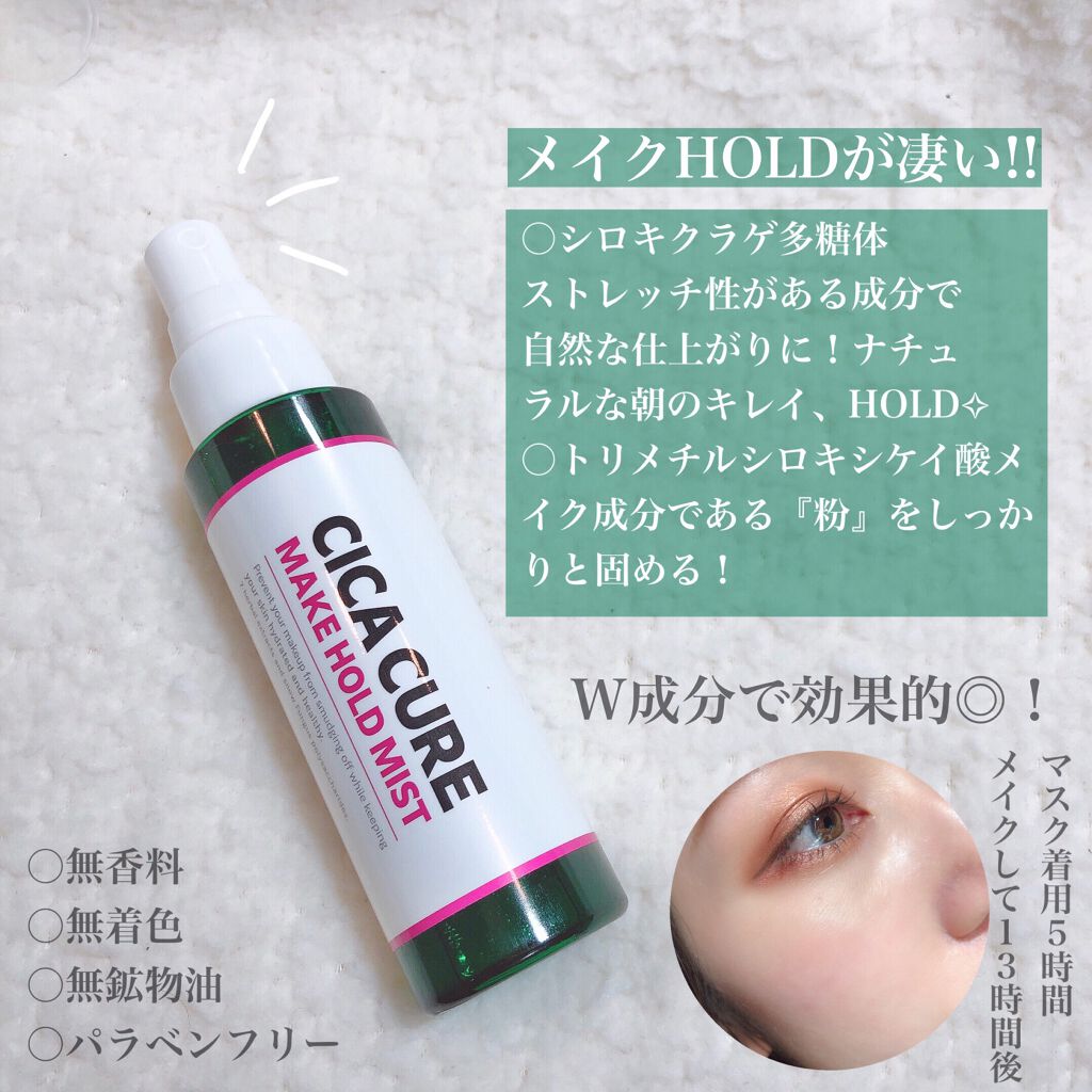 - メイク崩れ、マスクの摩擦、マスク内のムレCICACUREメイクホールドミストがお悩みを丸ごと解決!ただ固めるだけじゃないハード&ソフトのダブルのメイクホールド成分で、自然に朝のキレイHOLD!!マスクによる肌荒れ、赤みをすばやく抑えるキープミスト