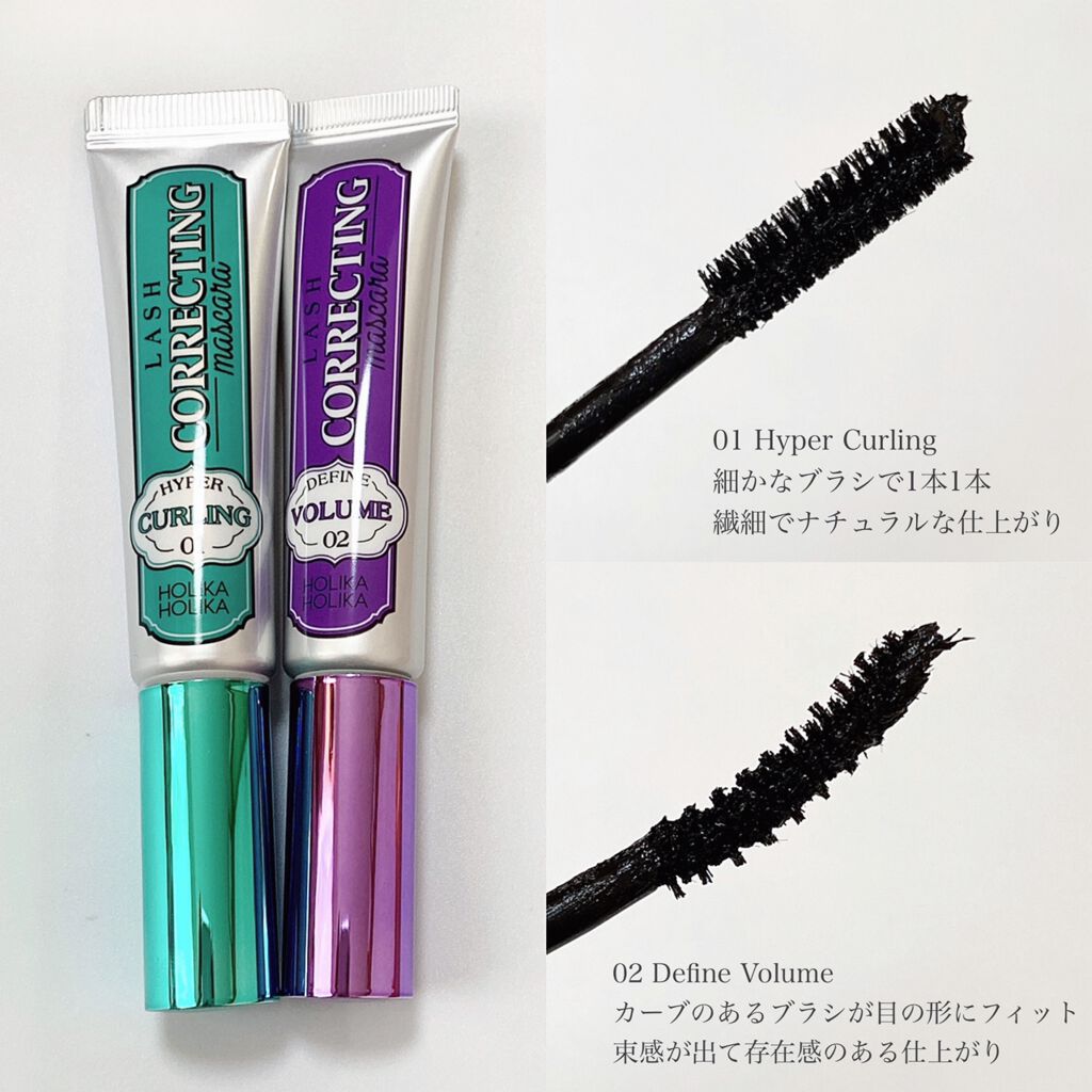 好みに合わせて選べるホリカホリカマスカラ✨✧HOLIKAHOLIKAラッシュコレクティングマスカラ3種💚01.ハイパーカーリング歯ブラシみたいなブラシが特徴的!!01はふわっと軽めな仕上がりで液がべたっとつく感じもなかった!🧡02.ディファイ...