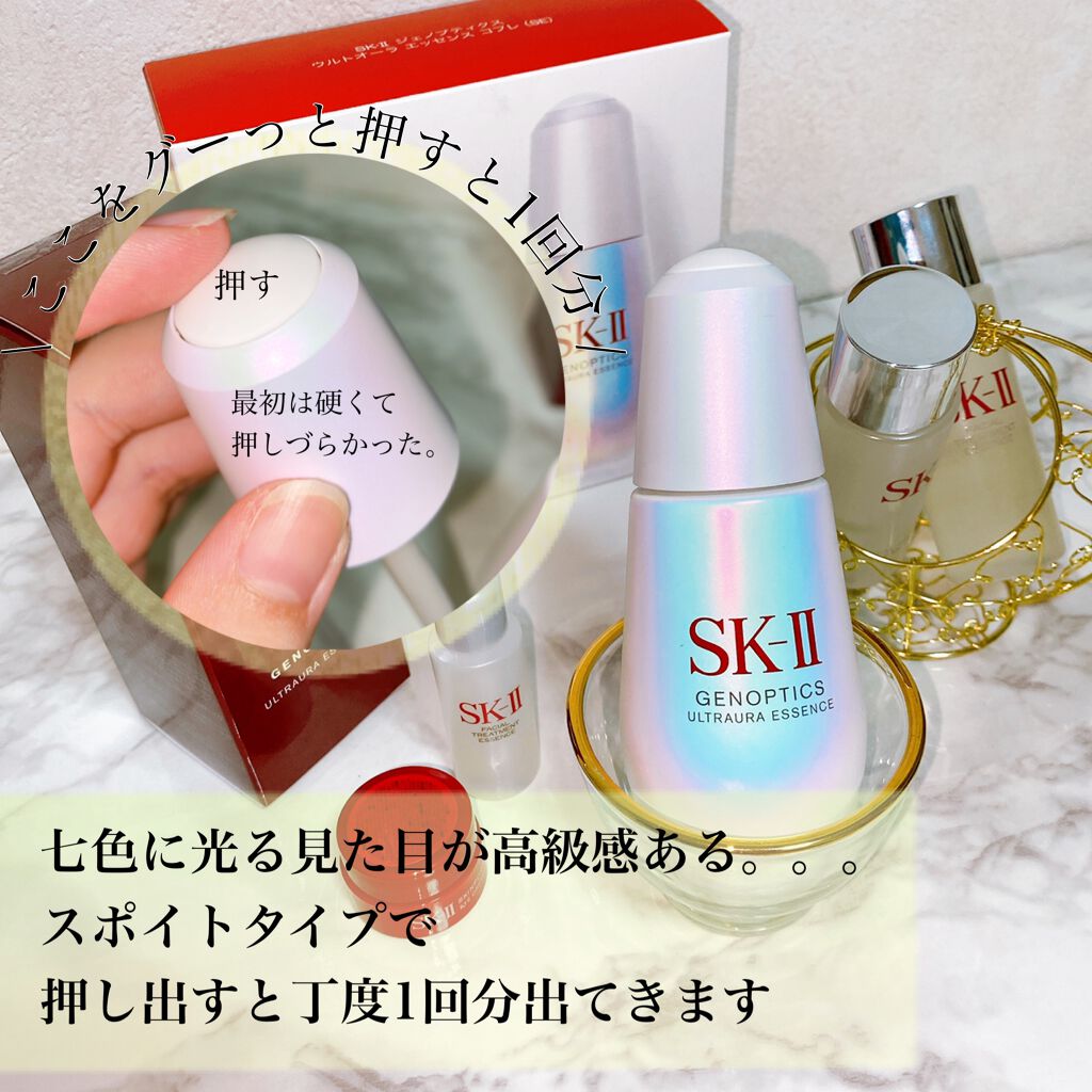 - より速く よりパワーアップした 新処方で明るく輝きにあふれる オーラ肌へ *SK-II GenOptics Aura Essenceより速くオーラ肌(明るく輝く肌)に導きます **SK-II GenOptics Aura Essenceと比べて保湿効果が高い 輝きがあふれ出す オーラ肌の 頂点を目指して SK-IIを代表するジェノプティクスシリーズの次世代。美白有効成分を含む新しいカクテル配合。