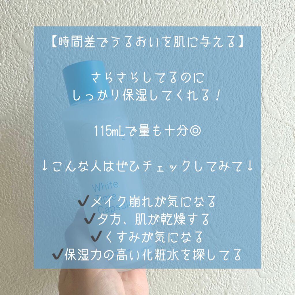 ごめんなさい、やっぱりミニの15㎖なので使った効果を感じられません 本体の115㎖を買えばよかった😩 『時間差保湿』で与え、満たし、逃さず、巡らせるが売りの商品だそうです⭐️⭐️ ホワイトタイムカプセルは時間と肌の潤いの関係に着目した新発想の化粧液です うるおう*¹のに一年中使えるみずみずしいつけ心地で、透明感のあるクリアな肌*²へと導きます