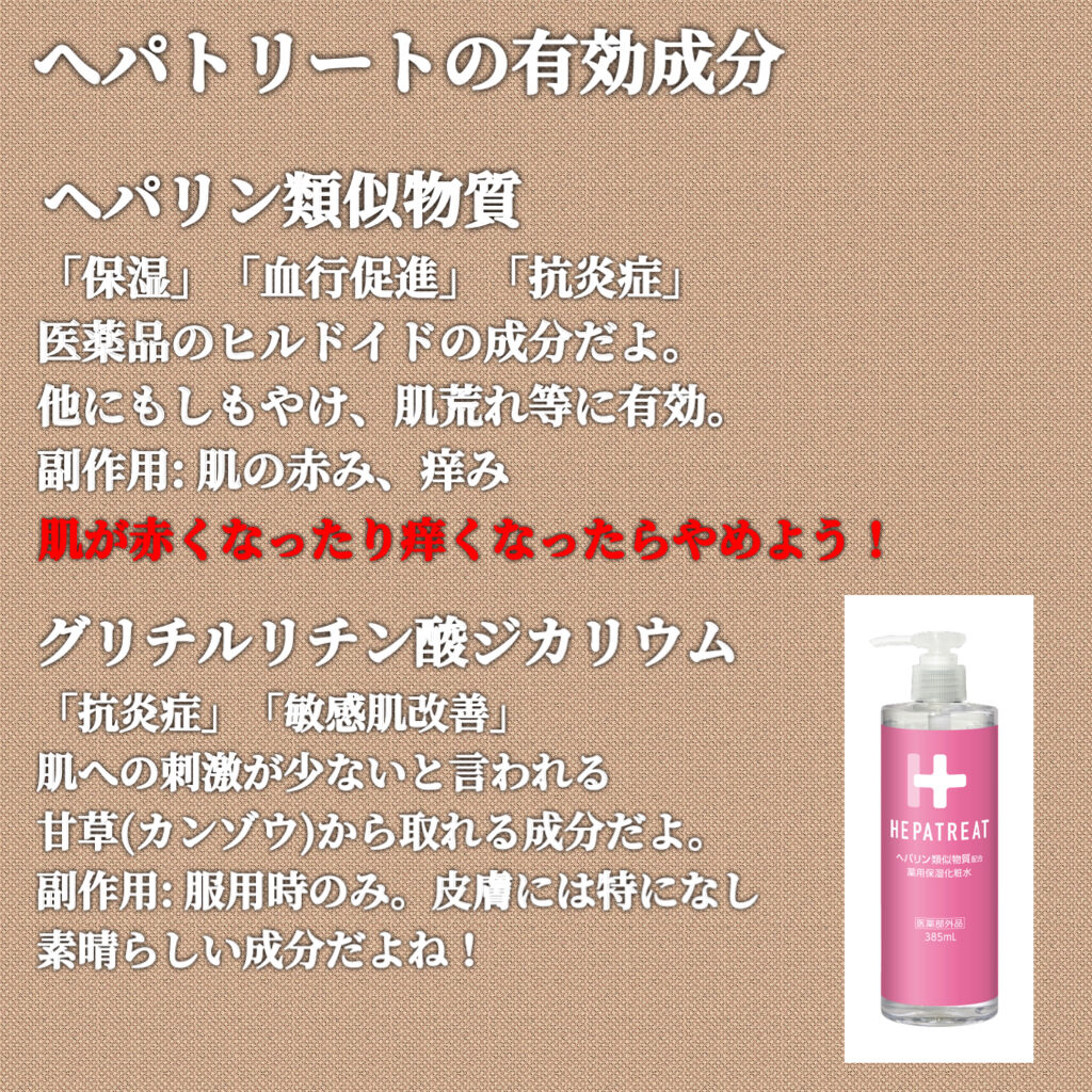 - ヘパトリートは保水有効成分のヘパリン類似物質と肌あれ有効成分のグリチルリチン酸ジカリウムを配合し、8つのフリーを実現。低刺激処方ながら高機能な化粧水です。さらに、薬用化粧水では珍しい大容量ポンプ(385mL)でとても使いやすく、赤ちゃんから大人まで、顔や全身の肌あれ・乾燥に使えます。 ■Wの有効成分 1.ヘパリン類似物質 顔・全身の乾燥を防ぐ 肌の乾燥による肌あれ/あれ性/皮膚を健やかに保つ/肌を整える/あせも/ひび/あかぎれ 2.グリチルリチン酸ジカリウム ニキビを防ぐ/肌をひきしめる/日やけ、雪やけ後のほてりを防ぐ/しもやけ/かみそりまけを防ぐ ■肌にやさしい低刺激処方<8つのフリー> 無香料/無着色/無鉱物油/無動物油/パラベンフリー/アルコールフリー/石油系界面活性剤フリー/シリコンフリー ※パッチテスト済み ※スティンギングテスト済み