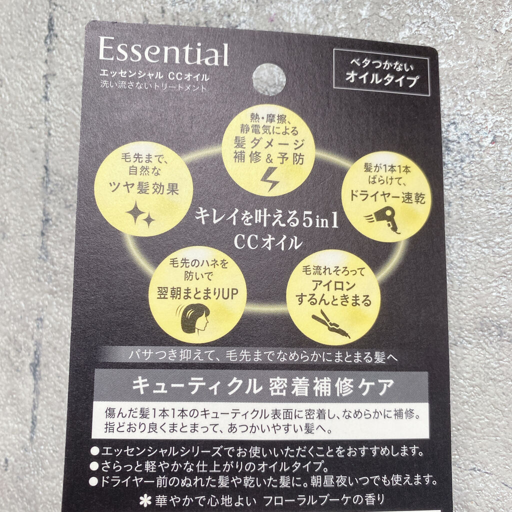 【コスパ最強!5in1のヘアオイル】「エッセンシャルCCオイル60ml」特売だったのか、600円ほどで購入できたこちらのヘアオイル、正直値段だけで選んだのですが、想像以上に良かったです😳5in1ということで、①ダメージ補修・予防②ツヤ髪効果③...