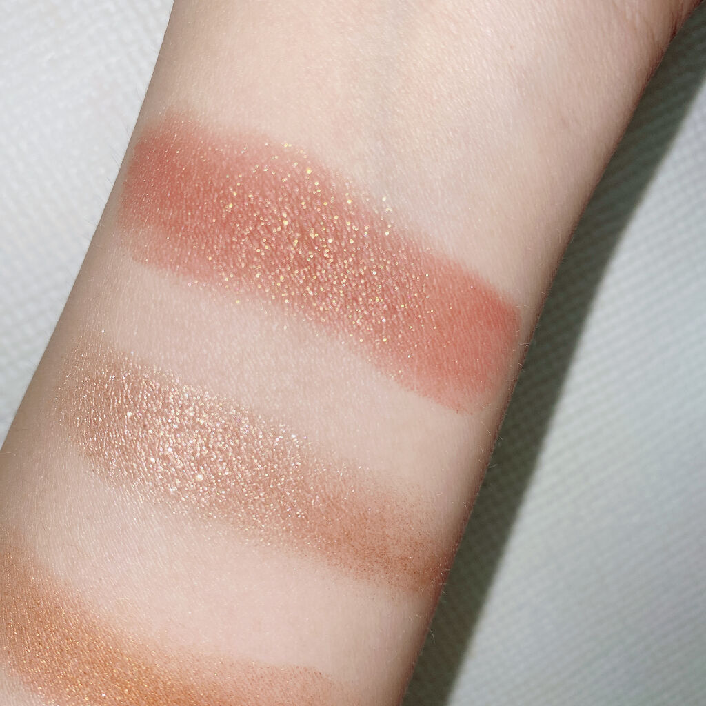 マットだけどどこかツヤ感もあるような柔らかい粉質……なのに粉飛びも少なめなので 瞼に乗せやすい🥰 5番のラメ感は控えめ。 シャンパンカラーに多色ラメがチラッ|˙꒳˙)✨ 実はこの番号通りにカラーを使うとプロ並みのメイクが完成するらしいです……‼️ ケースも薄くてコンパクトなのにベースカラー、ラメ、締め色、チークまで付いてるので 持ち運びやいつか行けるようになるであろう旅行などにも良さそうです❣️