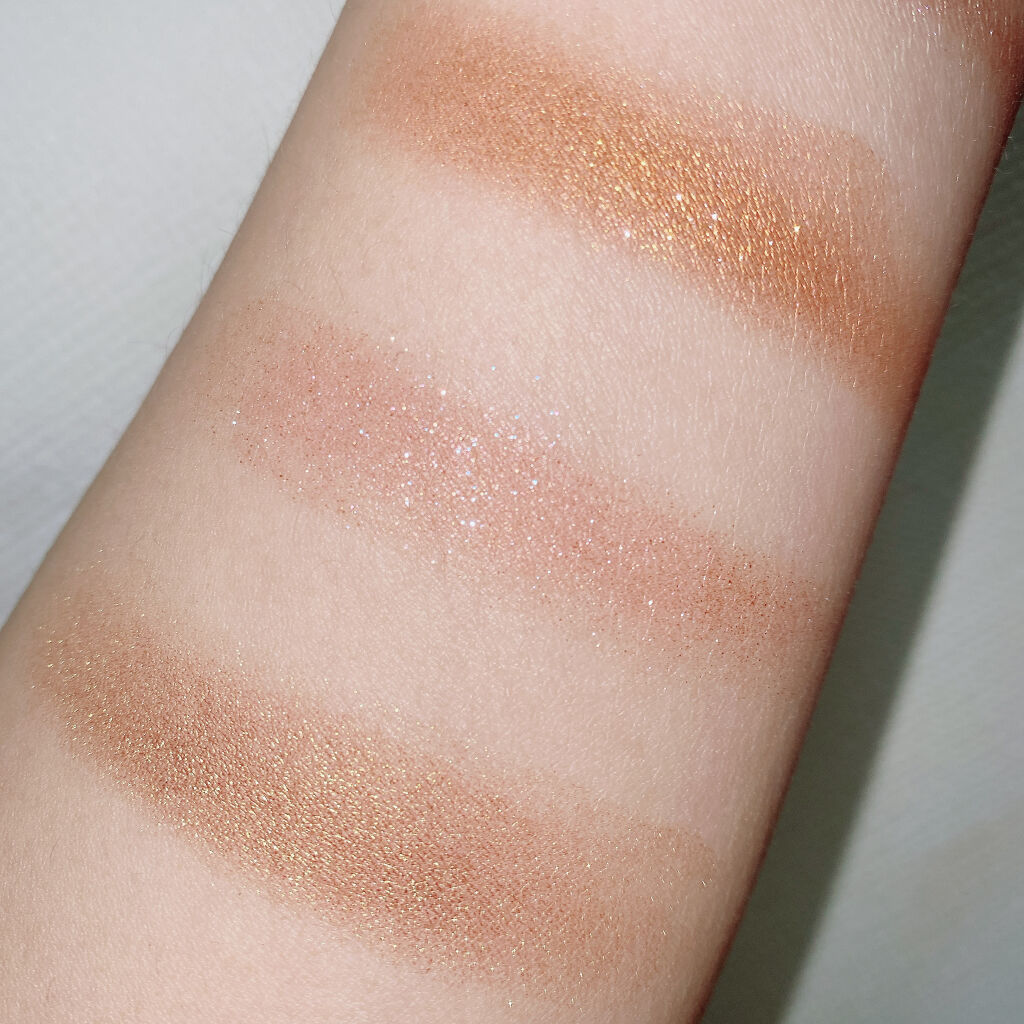 CLIOプリズム エアー ハイライター01 GOLD SHEERめちゃくちゃ細かなラメ入りで華やかな輝きなのに肌なじみが良いので白浮きしない‼️自然にしっかり立体感✨ CEZANNEパールグロウハイライト01 シャンパンベージュベージュとありますが地黒には結構白い😂綺麗なのでここぞとばかりの時は使いますが普段使いでは無いかな?この中では1番白い感じです✨付属の筆も使いやすいので持ち運びや急いでる時はなどに活躍します❣️ CANMAKEハイライターNo.L01 シャンパンゴールド色味はホワイトベージュっぽいのでCLIOやCEZANNEに似てて、少しキラキラはしてますが、輝きは控えめなのでとっても使いやすい🥰いい意味で普通✨ ZEESEAx大英博物館エンジェルangelハイライトフェイスパウダー S02この中で1番ゴールドっぽいカラー✨肌なじみ抜群でナチュラルなのにしっかり立体感は出してくれます❣️あと、パケが可愛い👼💓