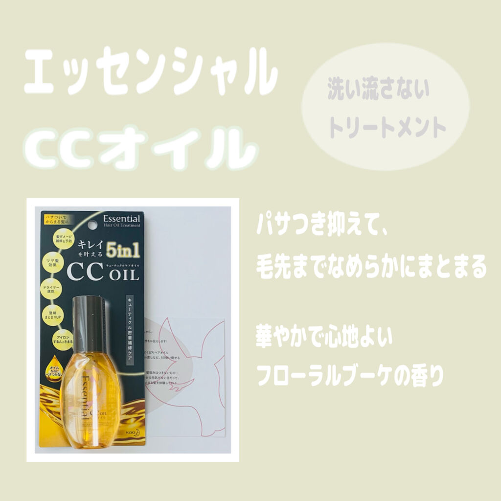 【商品】エッセンシャルCCオイル¥836★商品の特徴★・髪ダメージ補修&予防・ツヤ髪効果・ドライヤー速乾・翌朝まとまりUP・アイロンするんときまる★髪全体&前髪比較★画像で詳しくご紹介しています❕ぜひご覧ください!🩶メリット🩶♡うねりを抑えて...