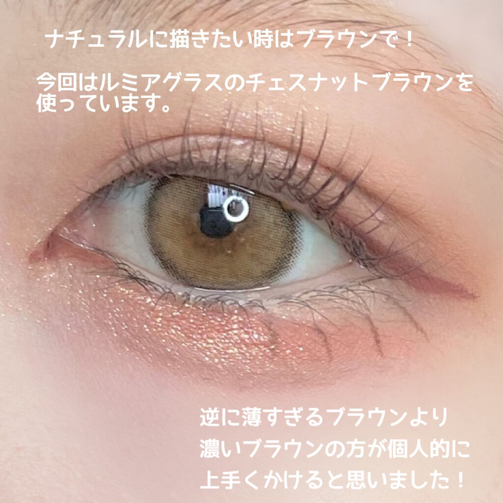 アイシャドウをグラデーションにするときに濃淡に気をつける。 アイラインはぶつっと途切れさせない! マスカラの色も重要で、ブラウンのマスカラを普段使っている方は少し赤みのあるブラウンマスカラを使ってみると、目元に自然な血色感がでてとってもおすすめです!