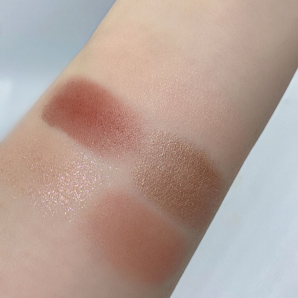 全体的な仕上がりは大人っぽくシックな雰囲気。 ちょっと儚げでスモーキーな感じもあるかな。 おとなしめと見せかけて右上のカラーに青ラメが入っていてさりげなく主張してくるのがすごく可愛い。 個人的には左上のハイライトとしても使えるベースカラーのほんのりピンクみを帯びているところが好き。 いかにもなハイライトじゃなくてほんとに肌に馴染むからナチュラルに使えるしアイメイクのベースに仕込んでおくと目元に明るさが出るし持ちも良くなるしメイクを底上げしてくれる感じがする◎ プチプラとは思えないしっとり質感と密着力の高さにも感動。 グレージュピンクがとても良かったのでチェリーオレンジも気になる、、、🍒🍊