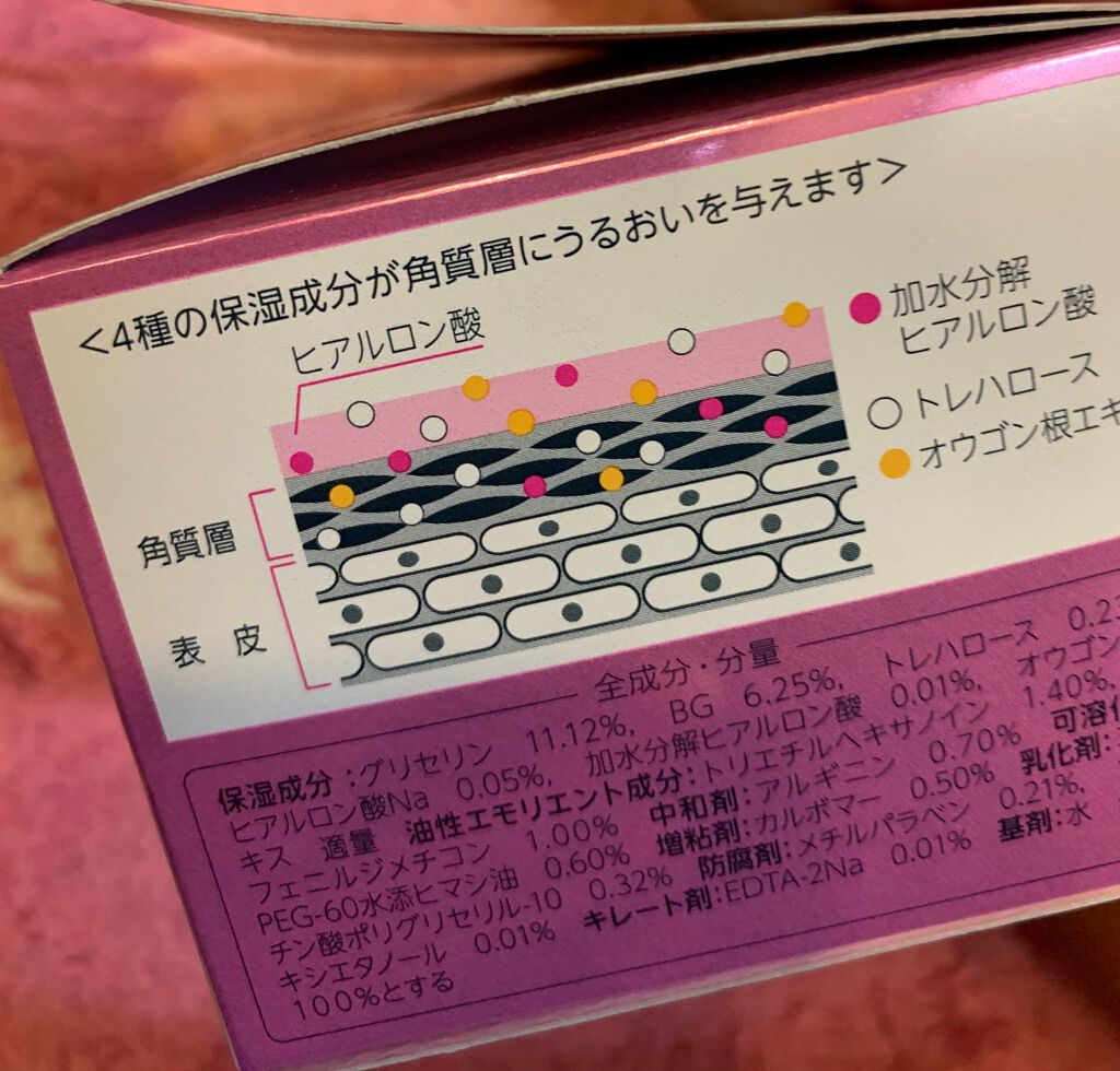 - 保湿成分 グリセリン 11.12%、BG 6.25%、トレハロース 0.23%、ヒアルロン酸Na 0.05%、加水分解ヒアルロン酸 0.01%、オウゴン根エキス 適量 油性エモリエント成分 トリエチルヘキサノイン 1.40%、ジフェニルジメチコン 1.00% 中和剤 アルギニン 0.70% 可溶化剤 PEG-60水添ヒマシ油 0.60% 増粘剤 カルボマー 0.50% 乳化剤 ミリスチン酸ポリグリセリル-10 0.32% 防腐剤 メチルパラベン 適量、フェノキシエタノール 適量 キレート剤 EDTA-2Na 0.01% 基剤 水 全量を100%とする