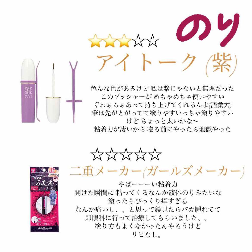 | 二重のり・アイテープランキング第17位 | スーパーハード・超速乾タイプ。違和感もないし、アイシャドウの上からやっても綺麗になる! | 詳細を見る | |