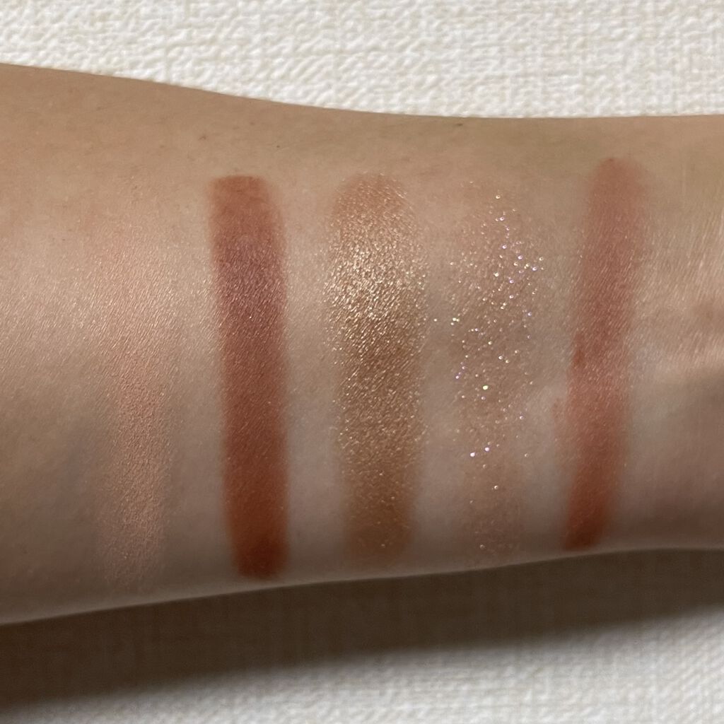 左上:ホワイトゴールドのパールとラメ(パール強め) 右上:偏光っぽいピンクのパールとラメ 左下:ホワイトベースにピンク系の偏光パール 左下:コーラルとシルバーのパールとラメ(ラメ強め) 左下のパールが、パッと見発色は弱いのですが すごく自然かつ絶妙なツヤ感を出してくれます。 こちらをCゾーンや目頭・鼻筋・顎先に、 右上のピンク系をチークの上部に重ねるのがお気に入り✨ 左上・左下はしっかり輝きを出したい時や、 アイシャドウ・チークに重ねて使うのもオススメです⭕️
